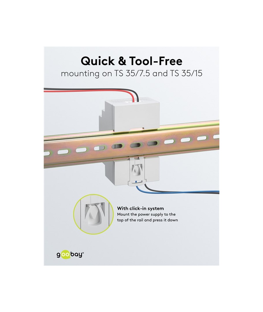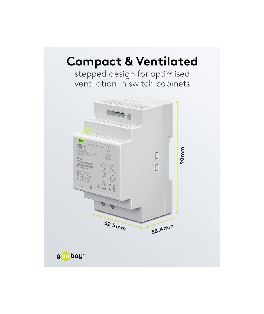 Deze voeding is gebouwd voor eenvoudige installatie op een DIN-rail. Met zijn compacte afmetingen van 52,5 x 90 x 58,4 mm past hij moeiteloos in de meeste elektrische panelen. Dit maakt ruimtebesparing mogelijk zonder concessies te doen aan prestaties of betrouwbaarheid.
