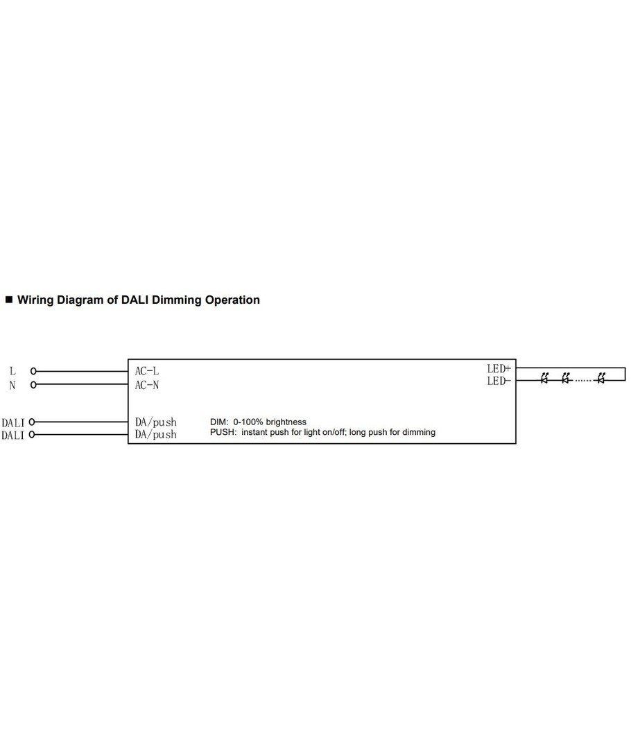 De voeding levert een constante uitgangsspanning van 12V DC met een maximale stroomsterkte van 10A. Hij is uitgerust met een DALI-interface en een push dimfunctie, waarmee de lichtsterkte nauwkeurig kan worden aangepast naar behoefte. Met deze functie creëer je de perfecte sfeer voor zowel thuis als in bedrijfsruimtes.