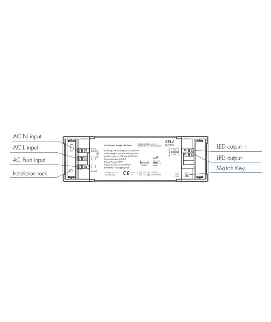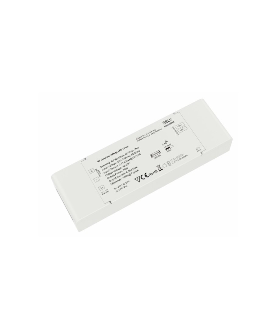 Let op de geavanceerde RF- en push-dimmtechnologie, die u de flexibiliteit geeft om de lichtsterkte van uw lichtinstallaties te wijzigen zonder het gedoe van traditionele dimmethoden. Deze functionaliteit maakt het product tot een perfecte keuze voor wie dynamische verlichtingsoplossingen wil creëren met één druk op de knop.