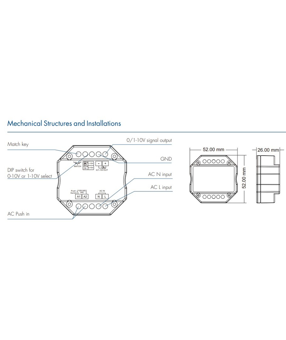 Met de compacte afmetingen van slechts 52 x 52 x 26 mm kan de rWave dimmer gemakkelijk worden geïntegreerd in bestaande elektrische installaties. Hij is ontworpen voor aansluiting op een 230V voeding, wat hem ideaal maakt voor moderne woonomgevingen.