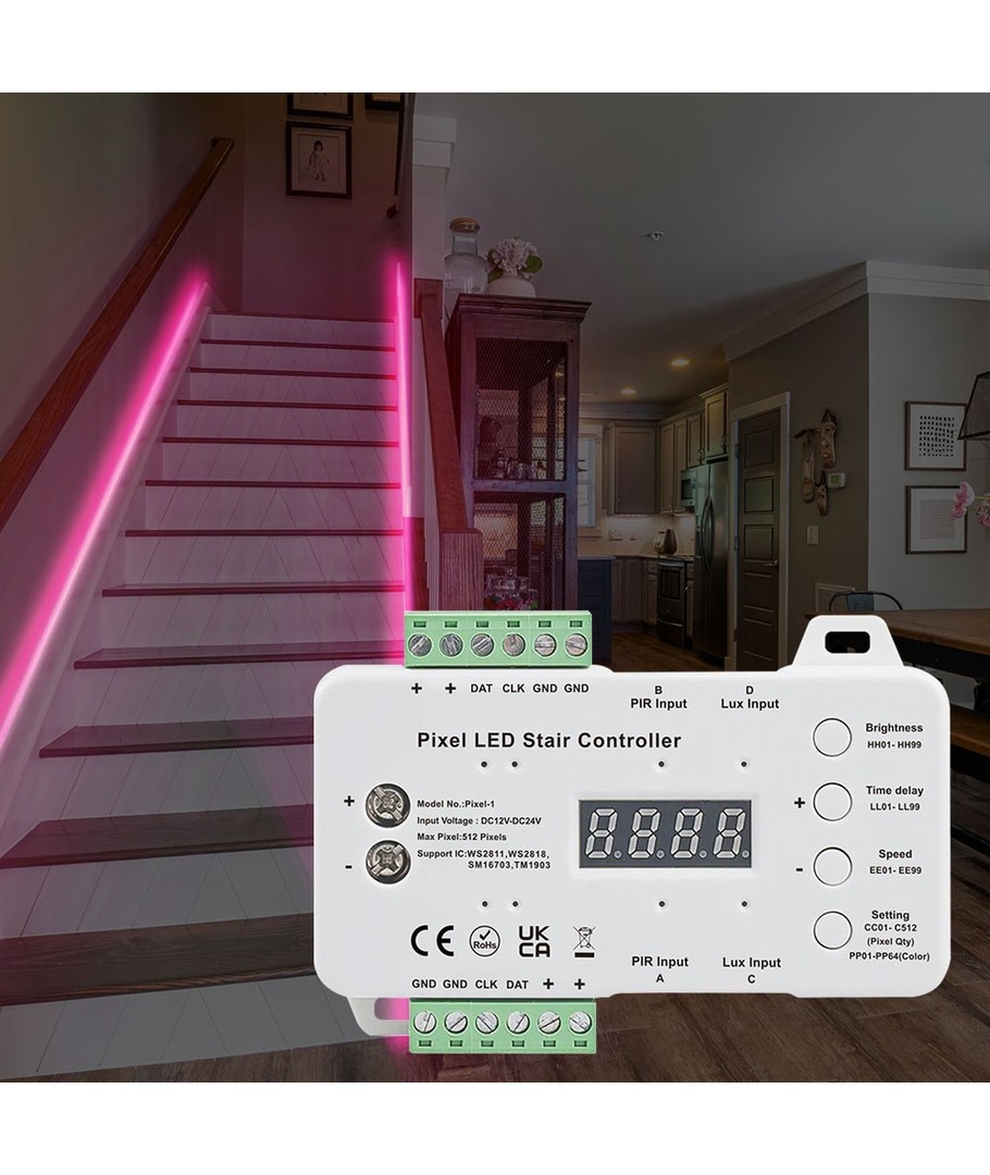 Dit intelligente besturingscentrum geeft u volledige controle over uw trapverlichting. Pas verlichtingspatronen en lichtsterkte eenvoudig aan met de meegeleverde sensor.