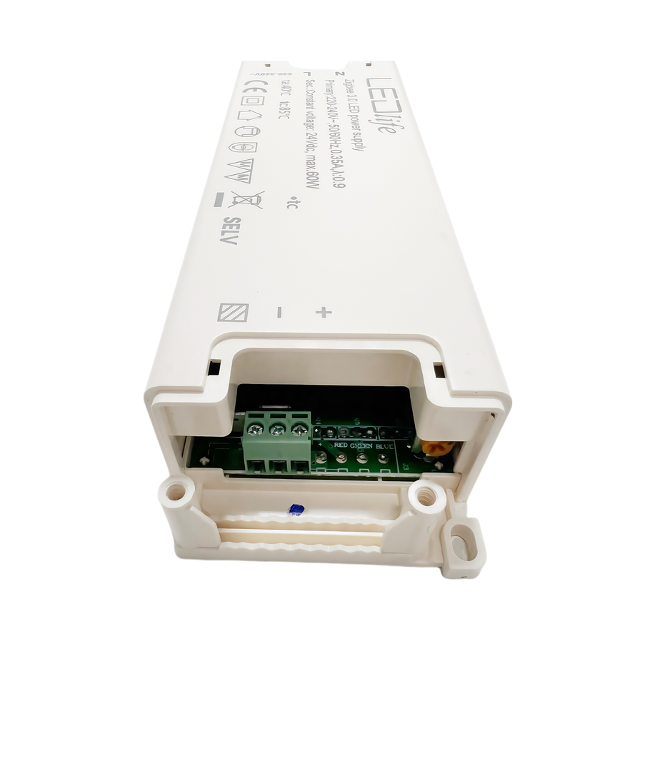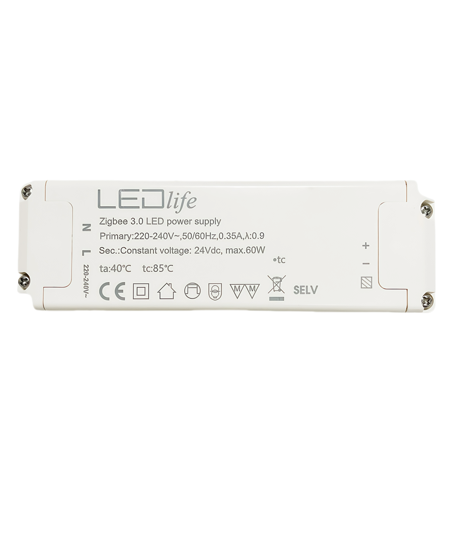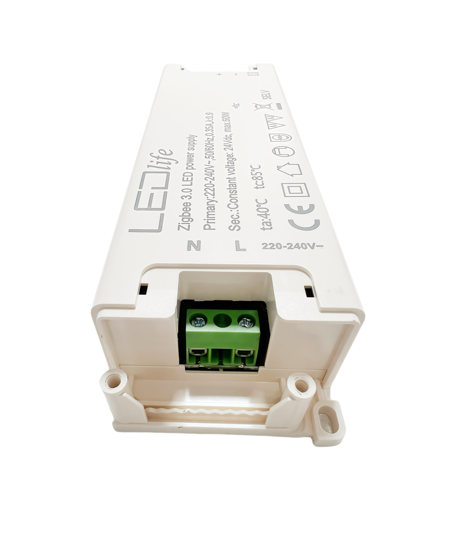 Deze 60W voeding is ontworpen voor degenen die hun LED-verlichting willen integreren met Zigbee-systemen, inclusief Hue-compatibele opstellingen. Om de installatie eenvoudig en probleemloos te maken, wordt het apparaat direct aangesloten op uw 230V voeding en levert het een stabiele stroom van 24V DC uit.