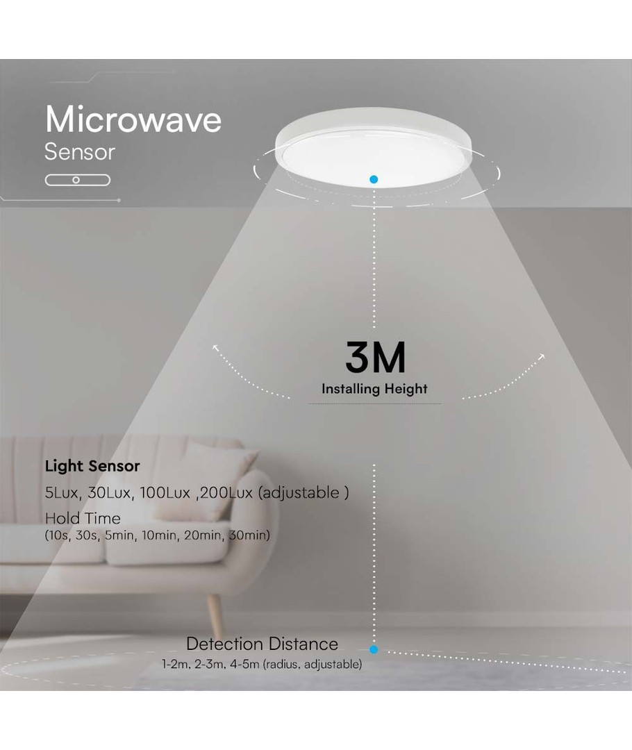 Deze lamp is uitgerust met een geavanceerde microgolf sensor die automatische activering garandeert wanneer beweging wordt gedetecteerd. Met een IP44 classificatie is de lamp geschikt voor binnengebruik, waar hij vochtige omstandigheden en spatwater aan de voorkant kan weerstaan.