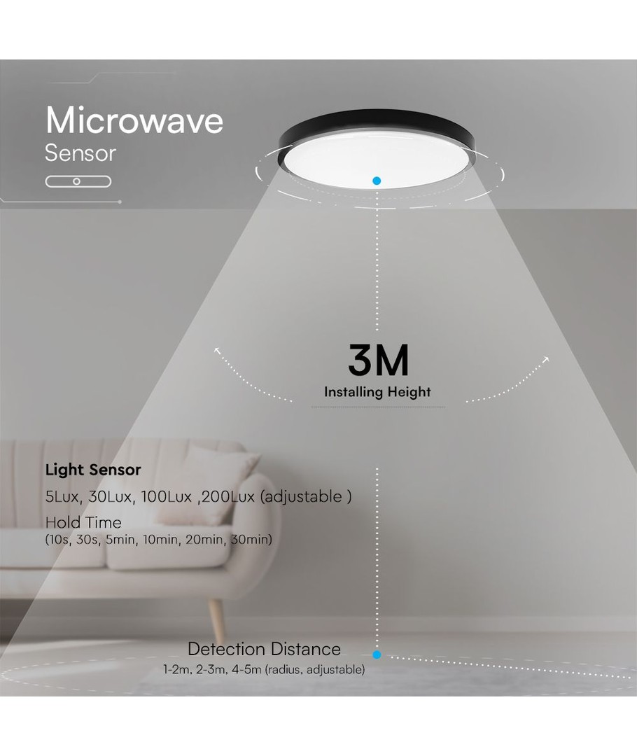 | Aanvullende opmerkingen | Light-on duration: 10s, 30s, 5min, 10min, 20min, 30min. Sensor distance: 1-2m,2-3m,4-5m(radius,adjustable). Ambient light level: 5lux,30lux,100lux,200lux(adjustable). |