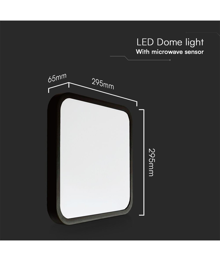 De lamp heeft een zwarte rand en een modern vierkant design met de afmetingen 295 x 65 x 295 mm, wat het zowel stijlvol als functioneel maakt. De geïntegreerde sensor past de verlichting aan op jouw behoefte, wat zowel energie bespaart als het comfort verhoogt.