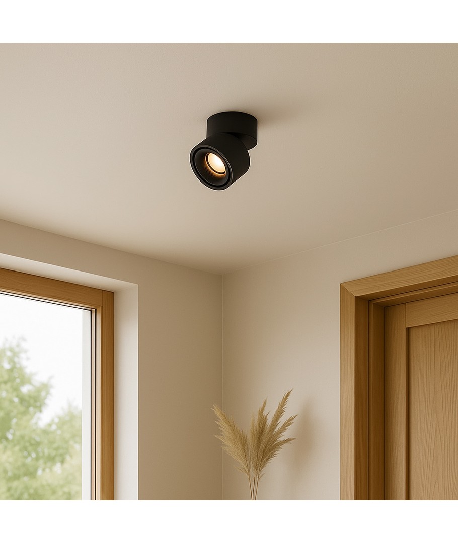 Met afmetingen van 100 x Ø100 mm past deze spot discreet in elke ruimte, terwijl de zwarte afwerking een moderne touch aan het interieur toevoegt.