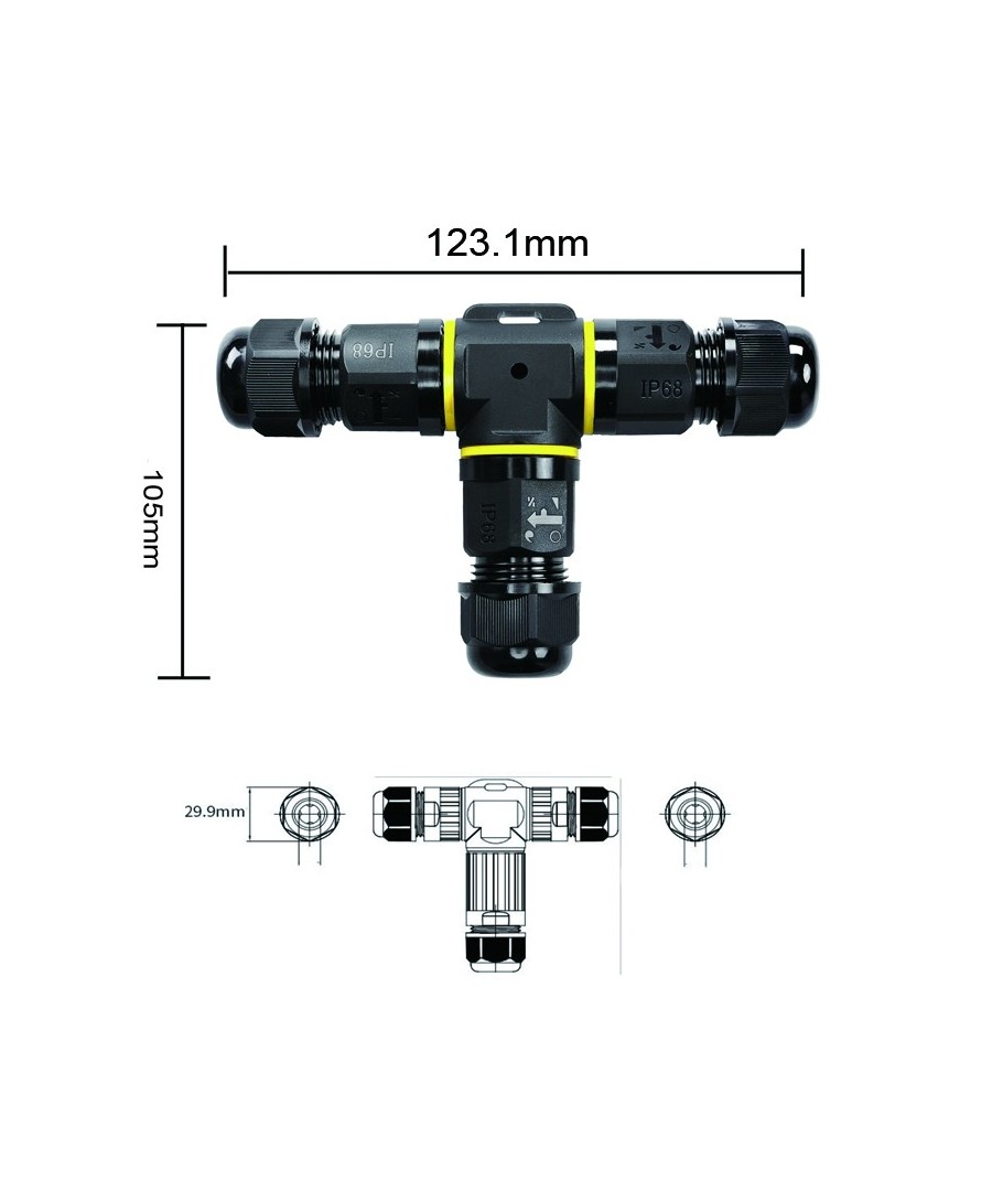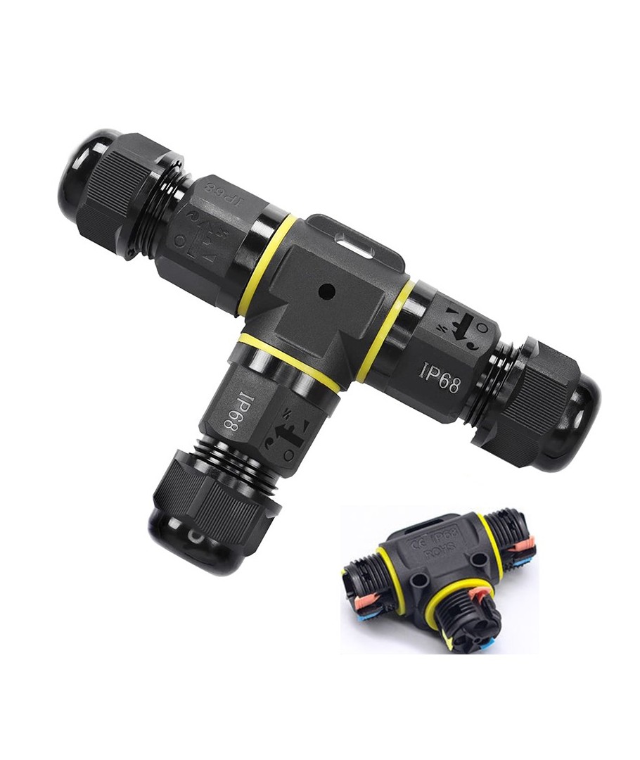 Zwarte waterdichte T-verdeeldoos voor draden met 3 geleiders.