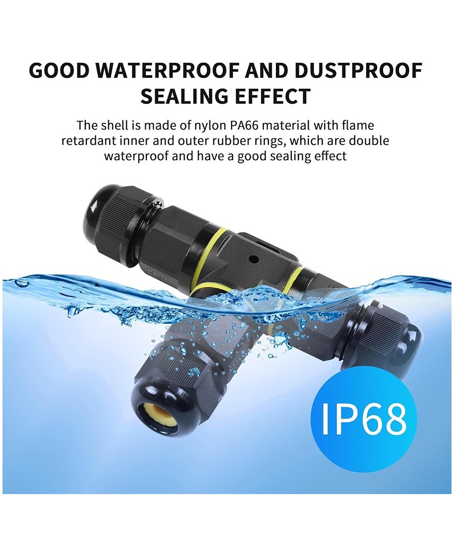 De verdeeldoos is geclassificeerd als IP68, wat betekent dat hij volledig waterdicht is en extreme omstandigheden kan weerstaan. Hij kan tot 1 meter diepte onder water liggen, waardoor hij ideaal is voor buitengebruik en vochtige omgevingen.