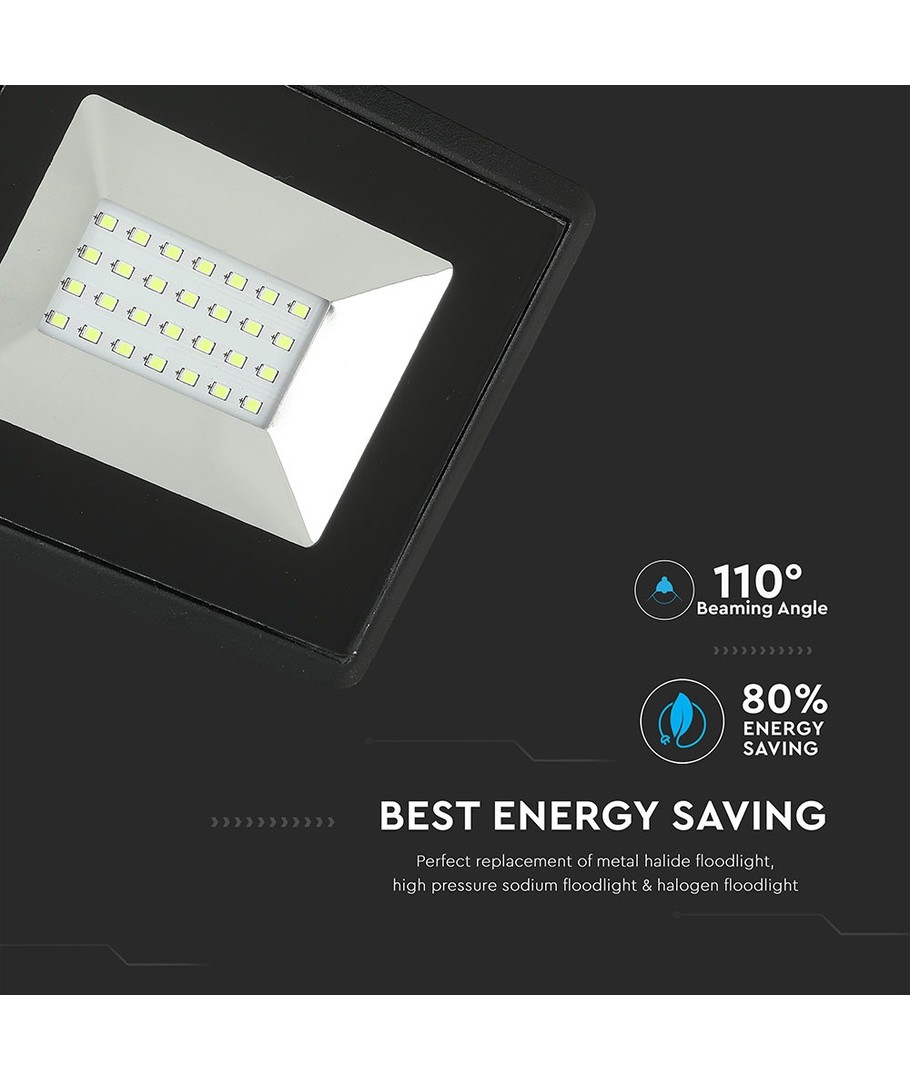De schijnwerper heeft een hoge spreiding van 110 graden, wat zorgt voor een gelijkmatige verdeling van het licht. Dit maakt hem perfect om grotere gebieden te voorzien van helder en consistent licht zonder donkere plekken.