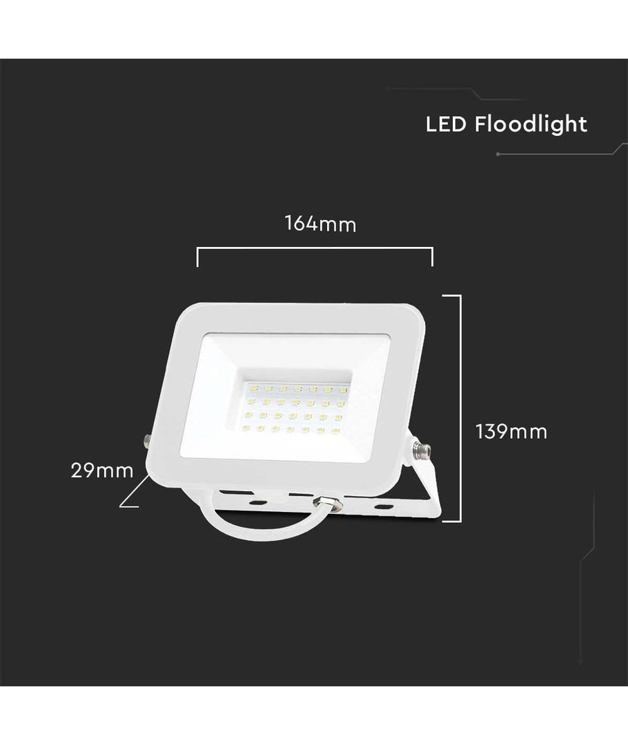 De schijnwerper is ontworpen met een IP65-geclassificeerde behuizing, die betrouwbare bescherming biedt tegen waterdruppels en regen, waardoor hij ideaal is voor buitengebruik onder verschillende weersomstandigheden. Met compacte afmetingen van 164 x 29 x 139 mm past hij gemakkelijk in diverse omgevingen zonder onnodige ruimte in te nemen.