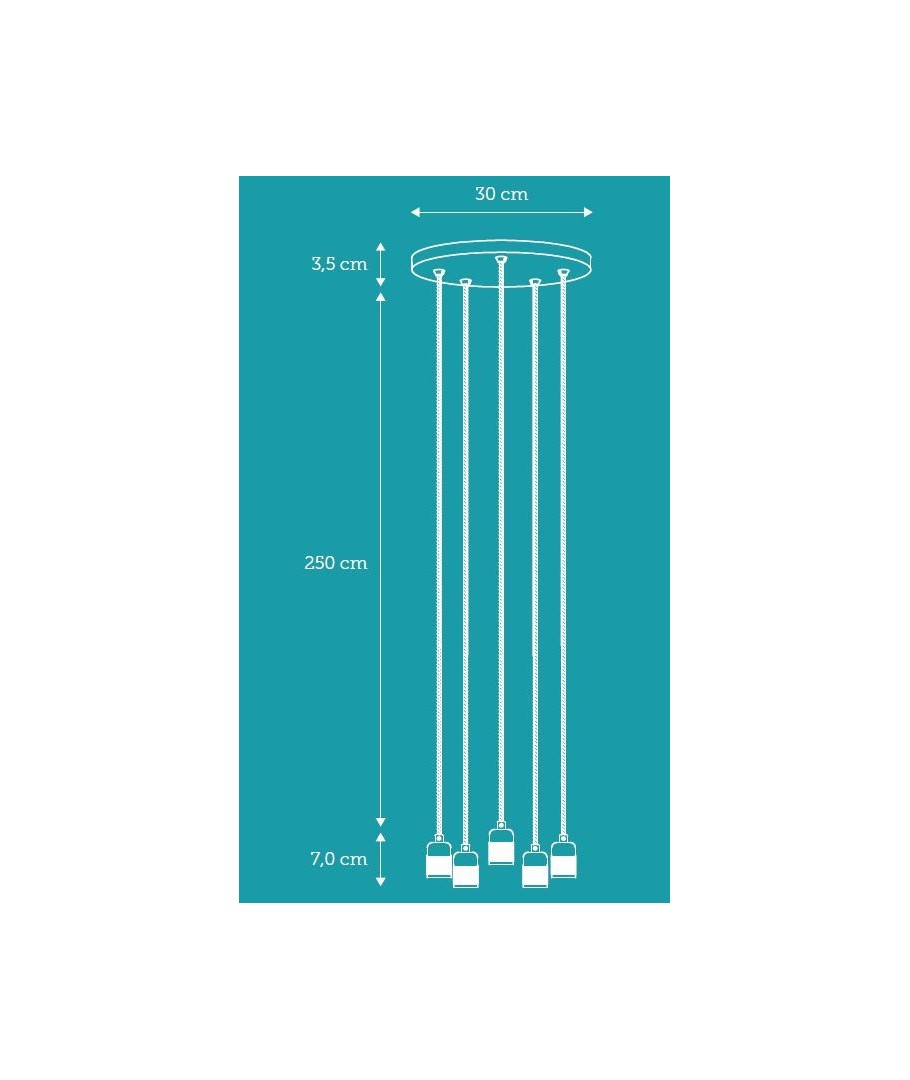 De 5 individuele fittingen hangen aan de plafondkap met elk een eigen prachtig zwart stoffen snoer van 2,5 meter.