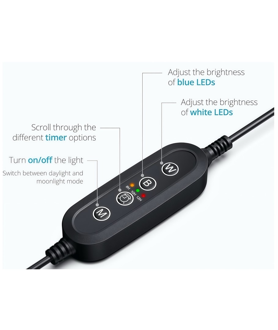 De combinatie van witte en blauwe LED's geeft een natuurlijke uitstraling en versterkt de kleuren van planten en vissen.