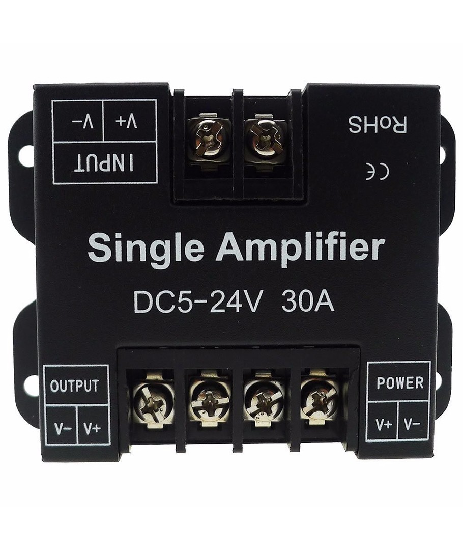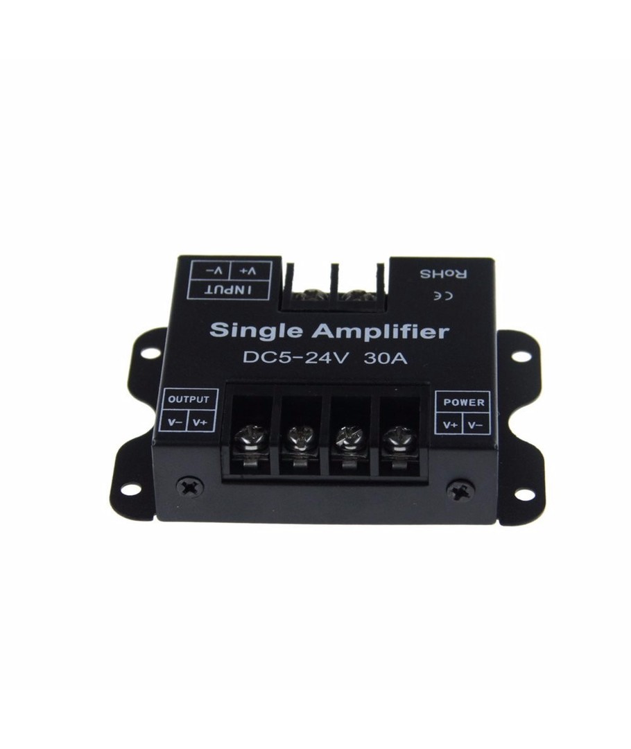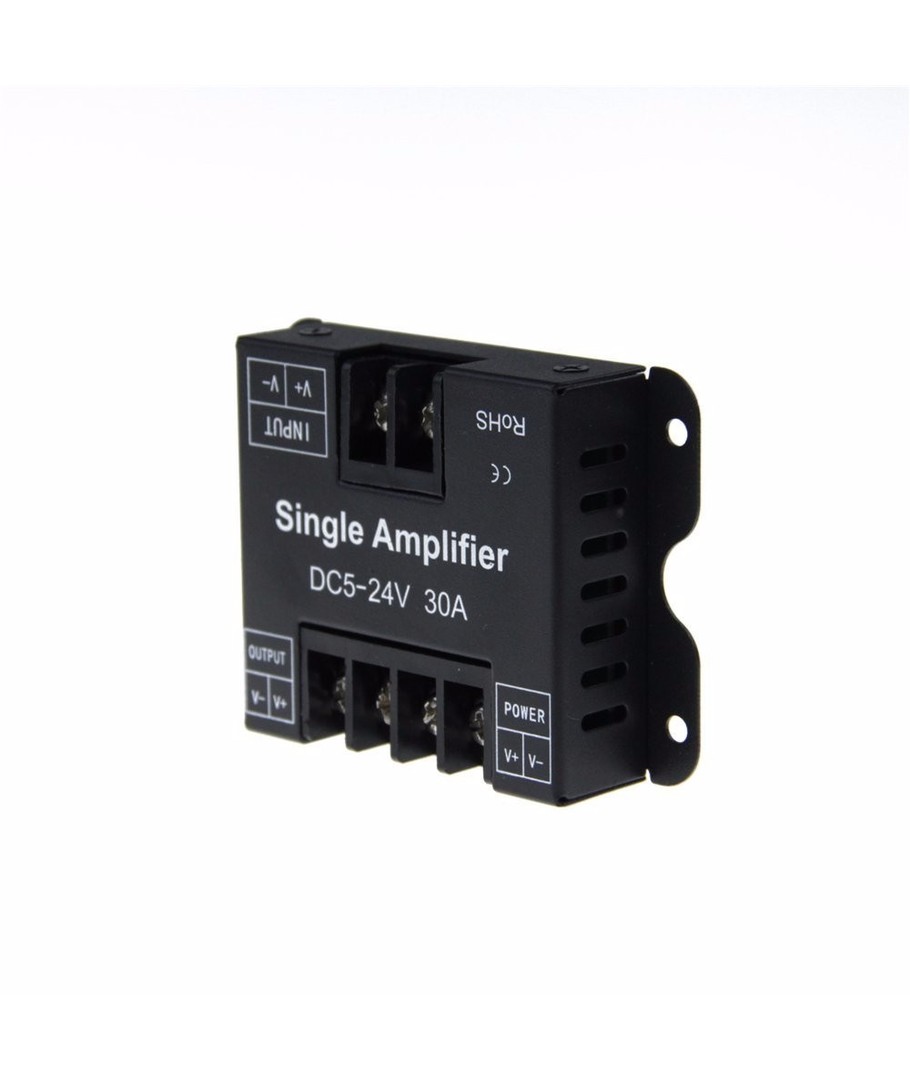 Signaalversterker voor enkelkleurige LED-strips. Input: DC 5-24V. Max: 30A. Temperatuur: -20 tot 70 graden. Dimt via PWM en werkt goed samen met deze dimmer.