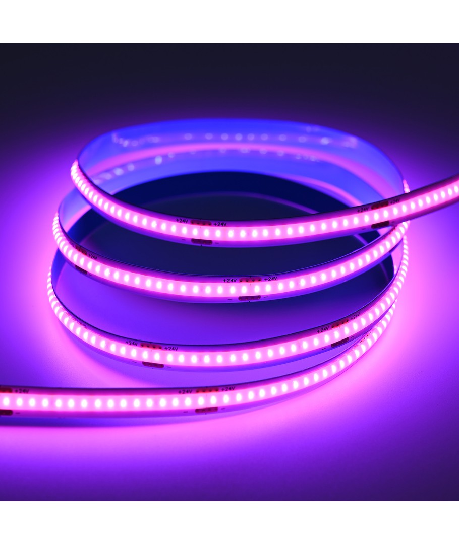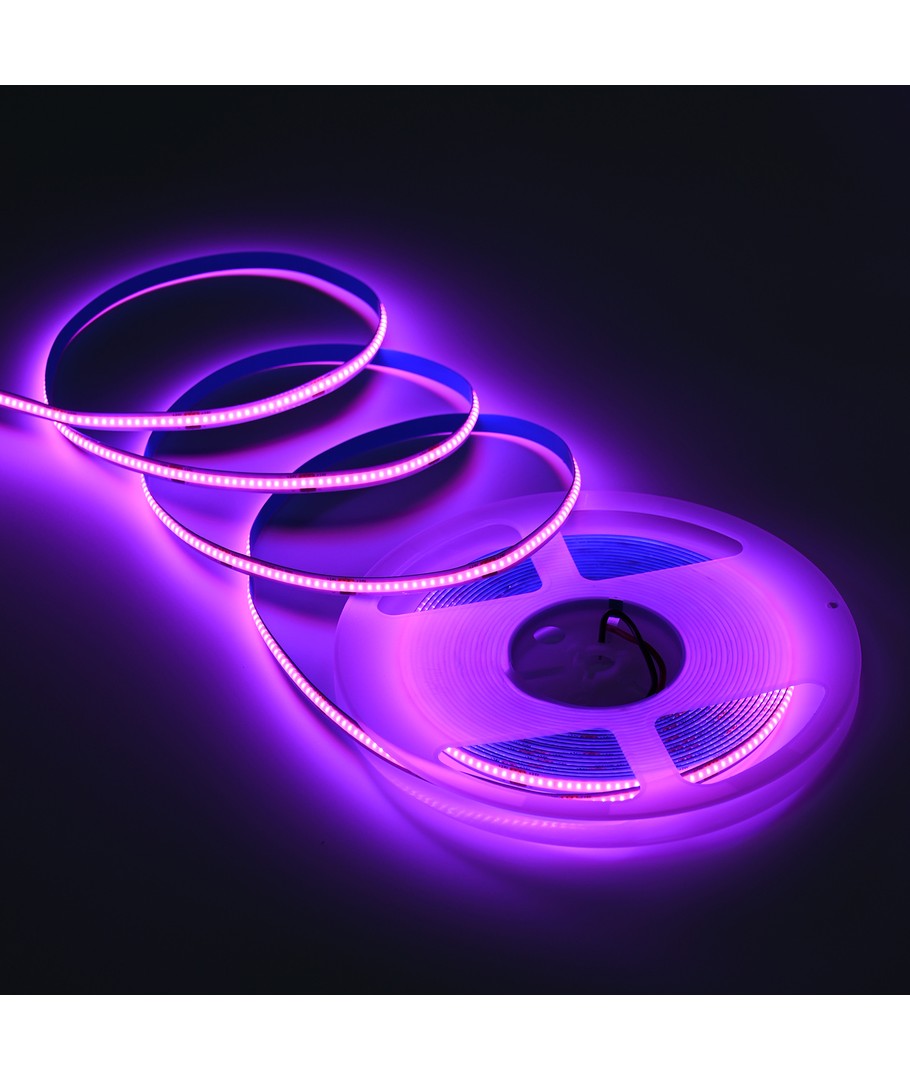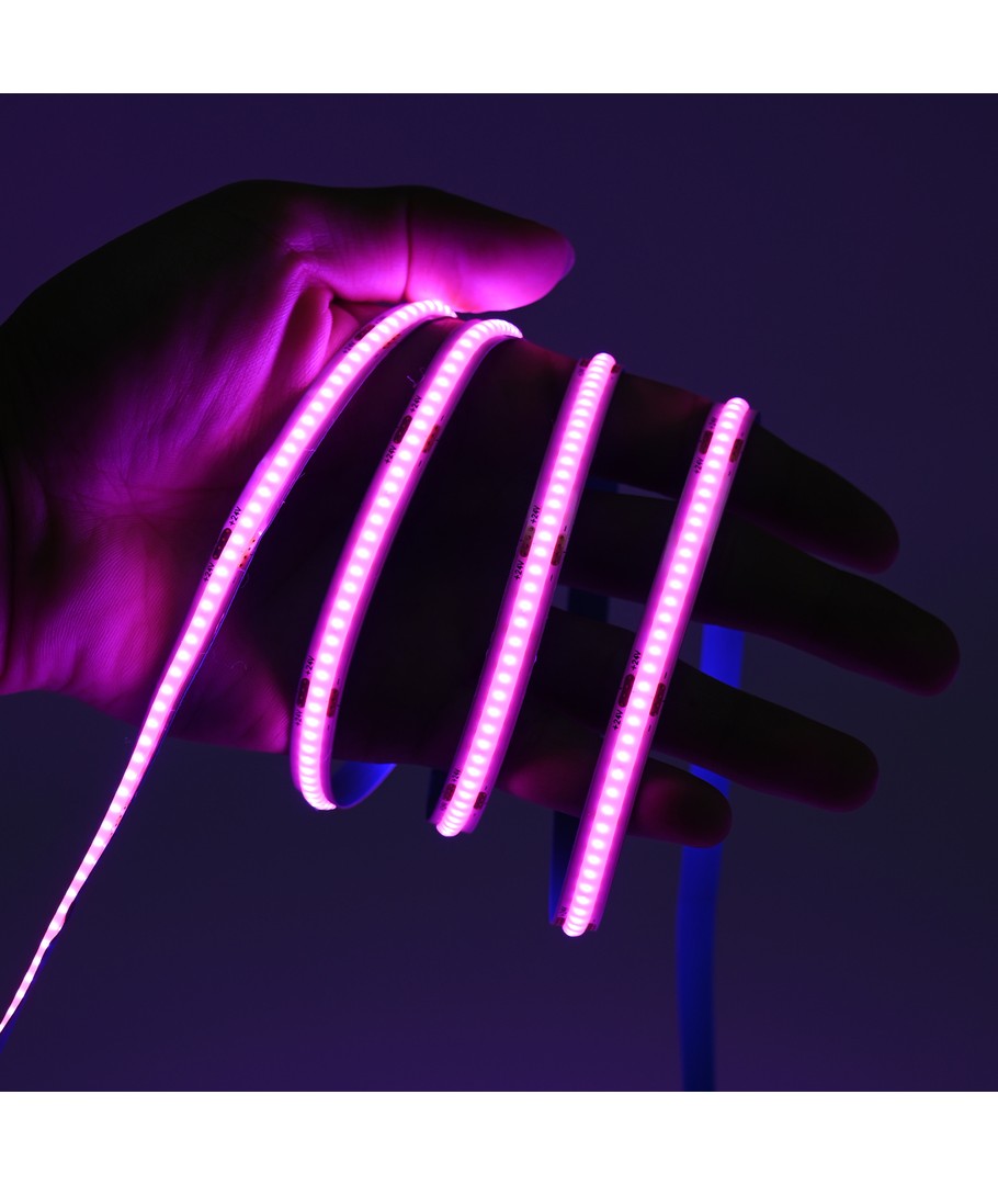 Eénkleurige roze COB LED strip met 320 LED's per meter.