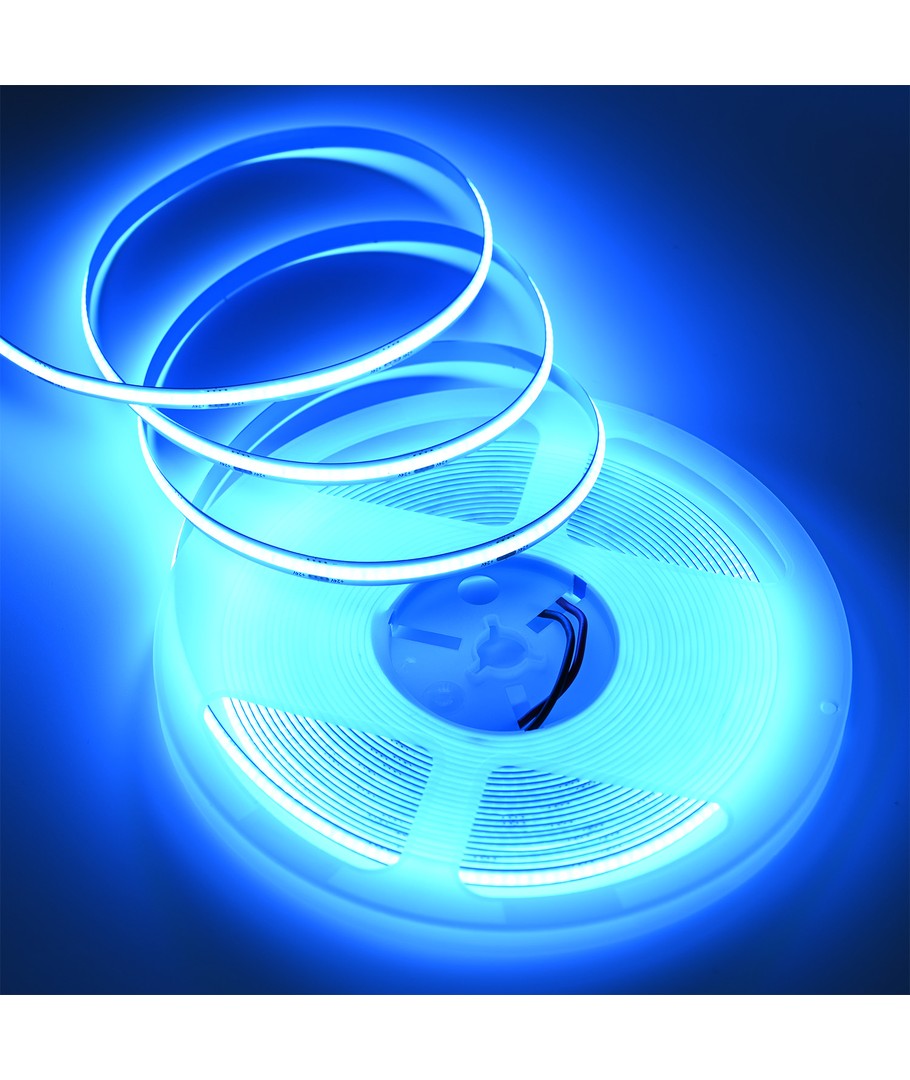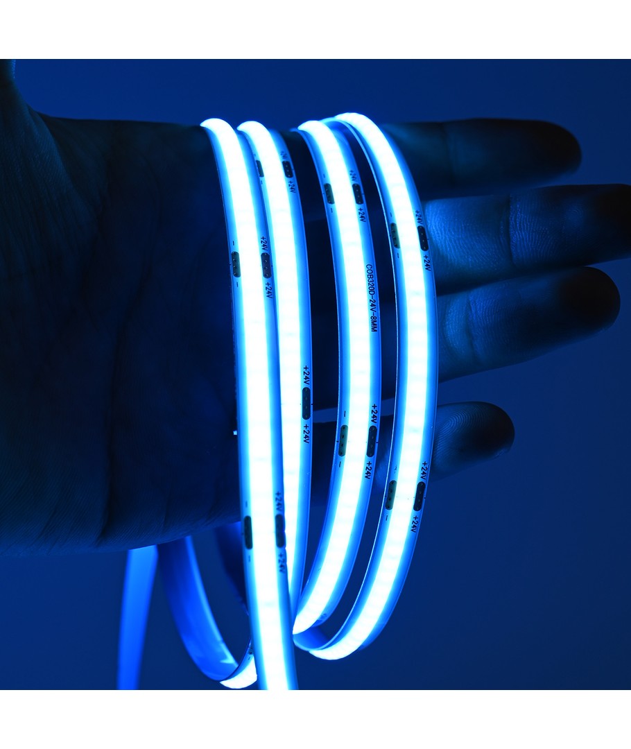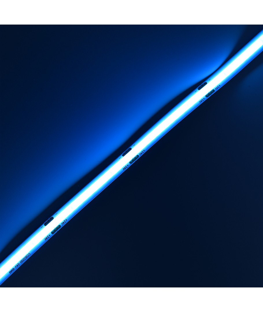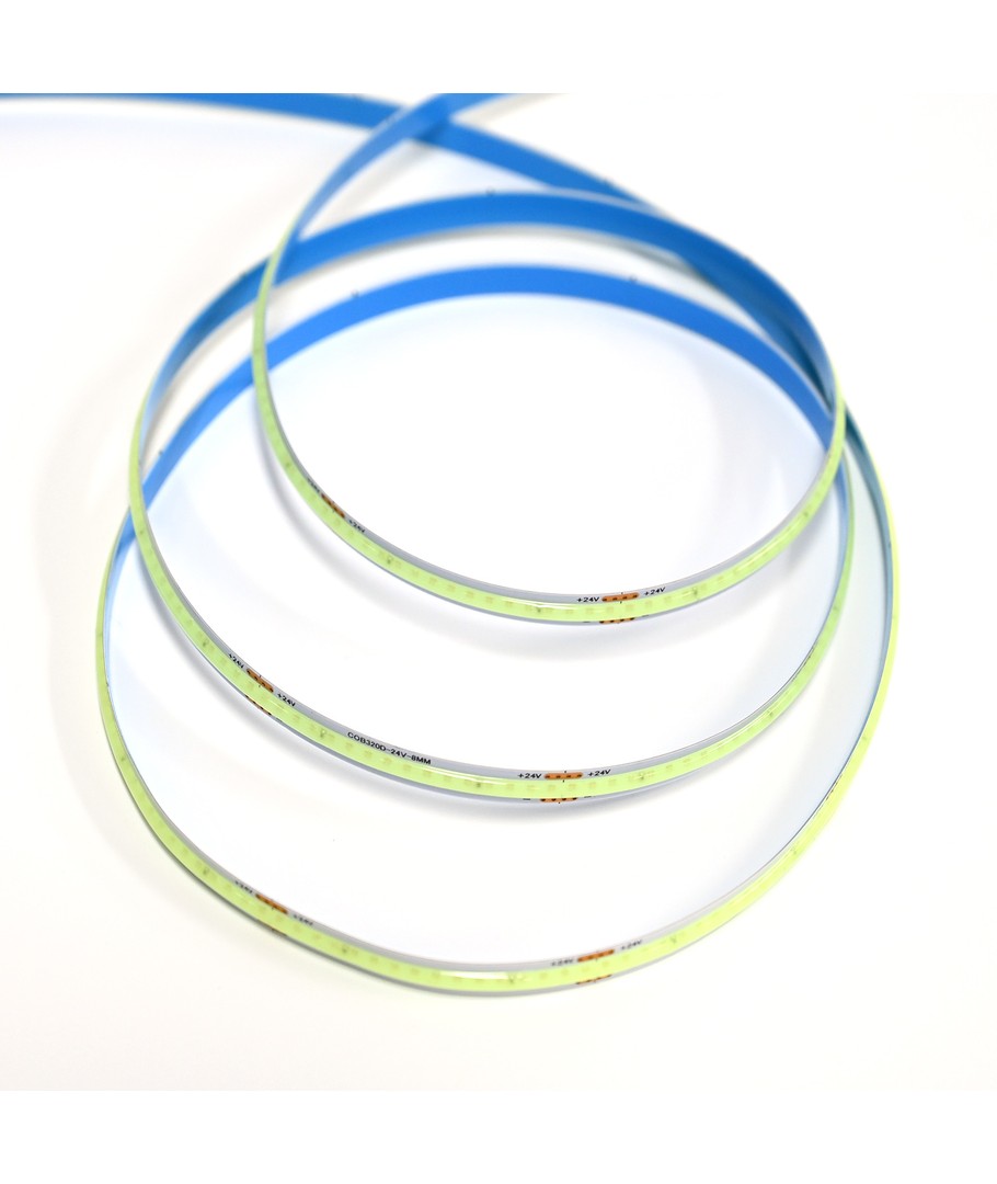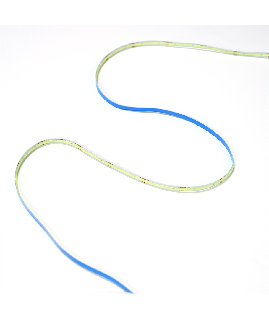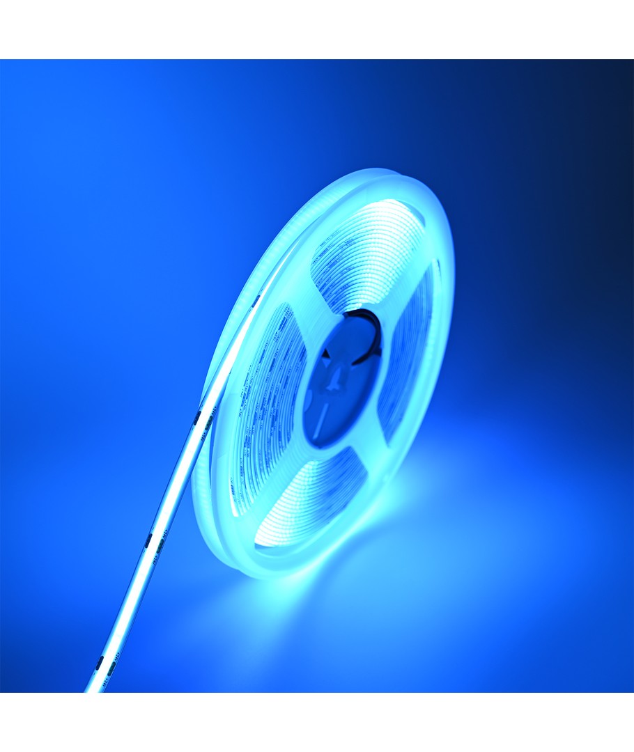 Eénkleurige lichtblauwe COB LED strip met 320 LED's per meter.