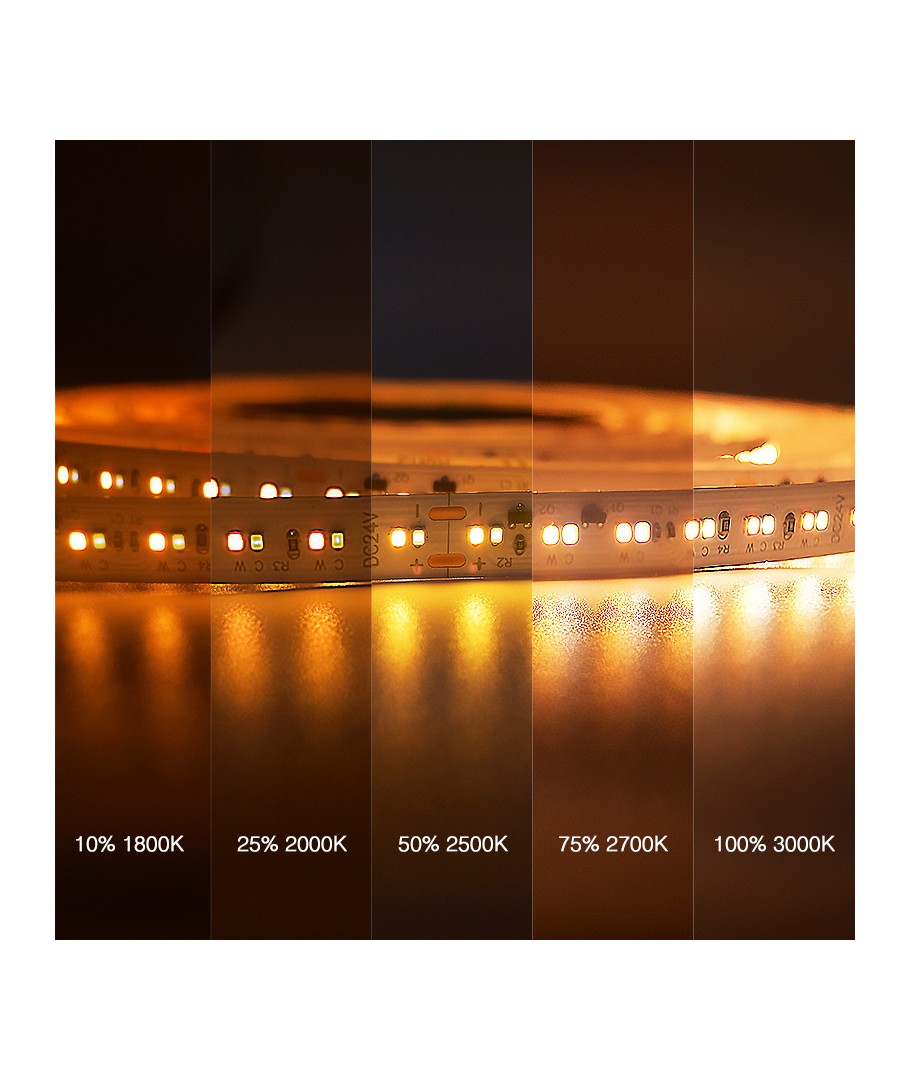 De LED-strip is ontworpen voor aansluiting op een 24V voeding en kan eenvoudig worden gedimd om aan uw gewenste lichtniveau en sfeer te voldoen. Dit maakt het een uitstekende keuze voor zowel zakelijke ruimtes als privéwoningen.