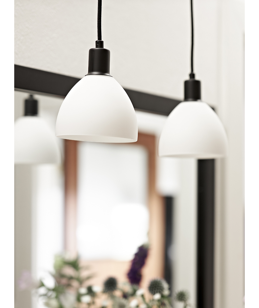 2 hanglampen in opaalglas met matzwarte fittingen opgehangen aan een zwart stoffen snoer.