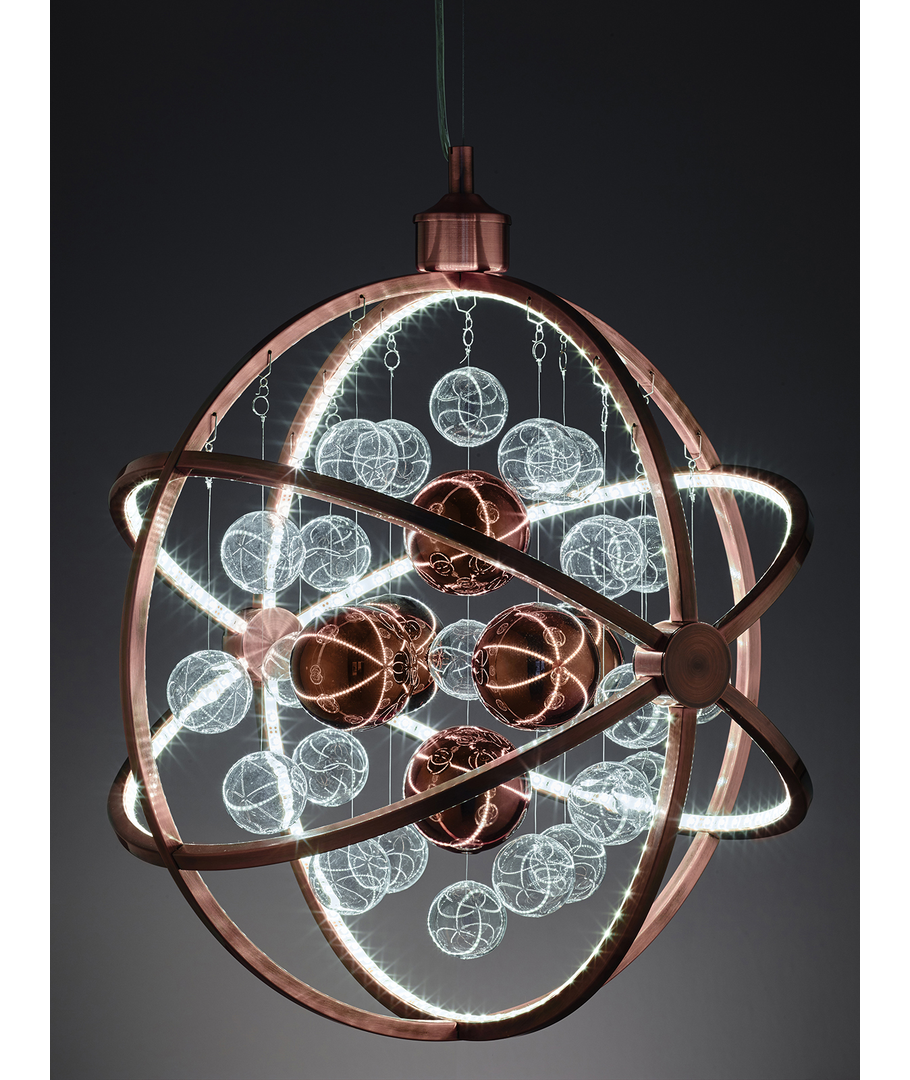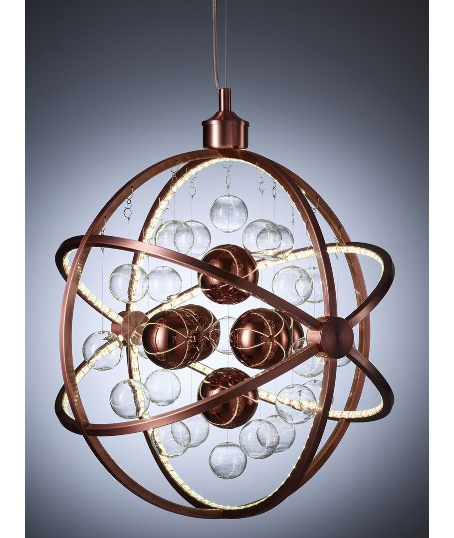 Galaxy Pendel in koper is uitgevoerd in metaal en glas, een unieke en fantastisch mooie LED plafondlamp. De lamp heeft een futuristisch design en zoals de naam al zegt, roept het associaties op met de melkweg.