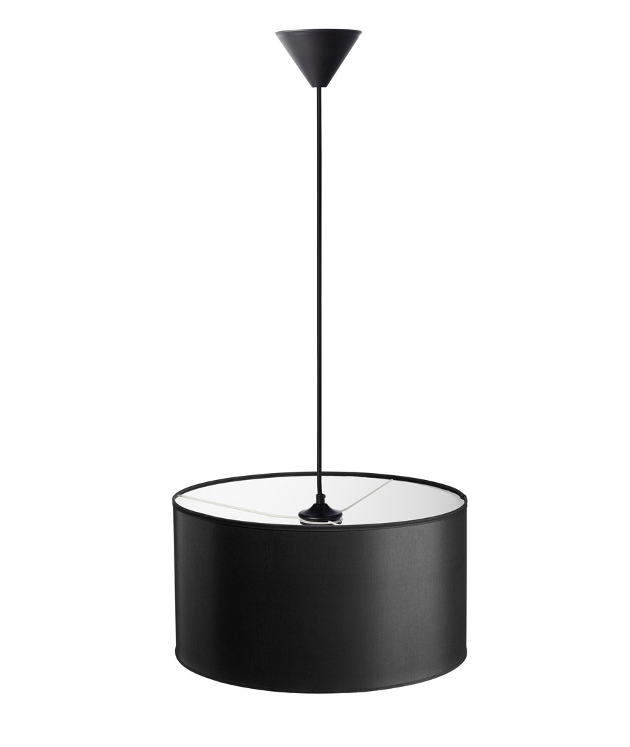 Lichte en elegante hanglamp van het Deense Nielsen Light, wit aan de binnenkant en bekleed met zwarte stof aan de buitenkant.