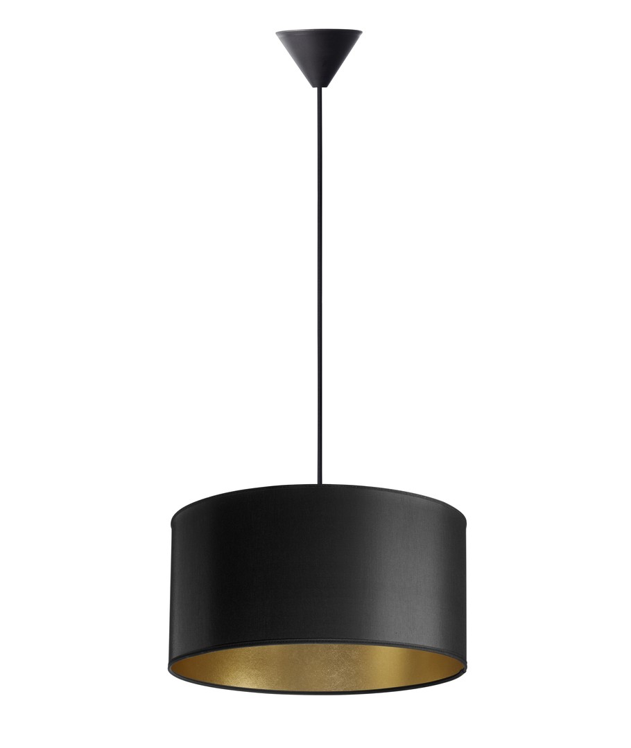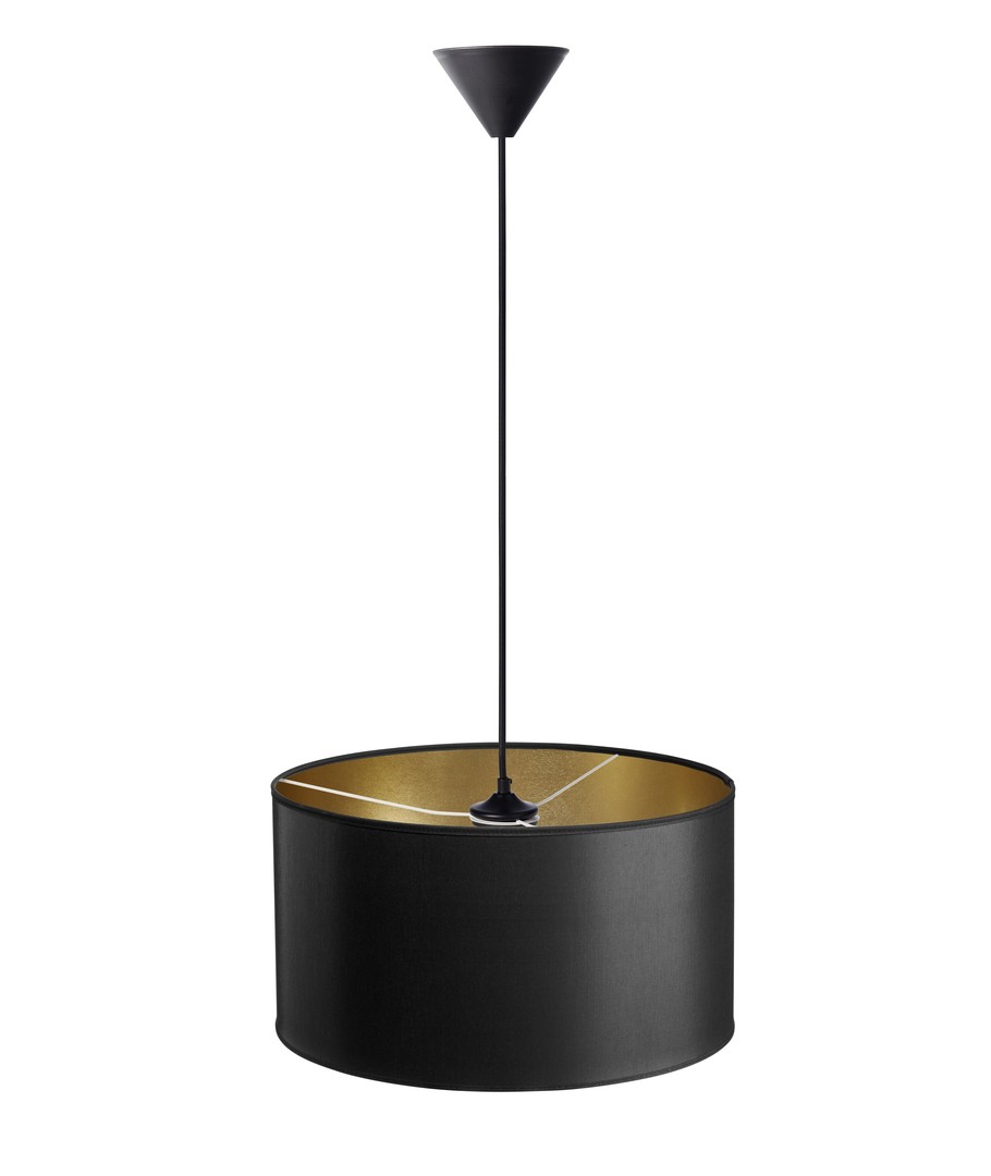 Lichte en elegante hanglamp van het Deense Nielsen Light, goudkleurig aan de binnenkant en bekleed met zwarte stof aan de buitenkant.