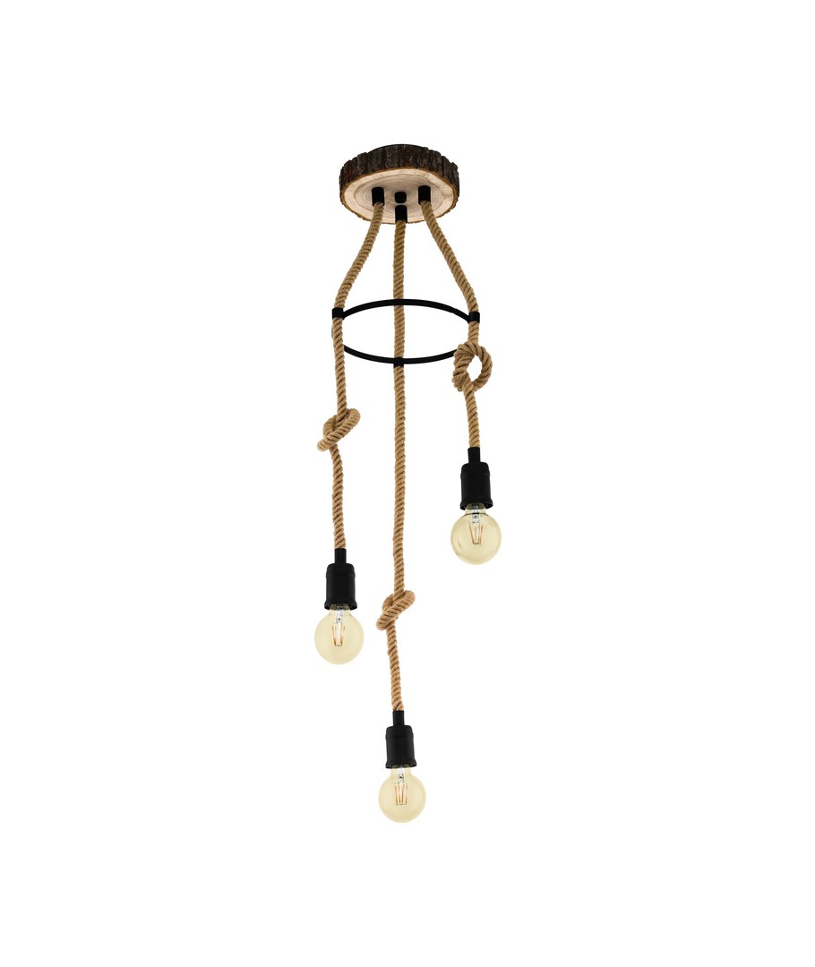 3 stuks E27 fittingen van zwart staal zijn bevestigd aan dikke, ouderwetse touwen.