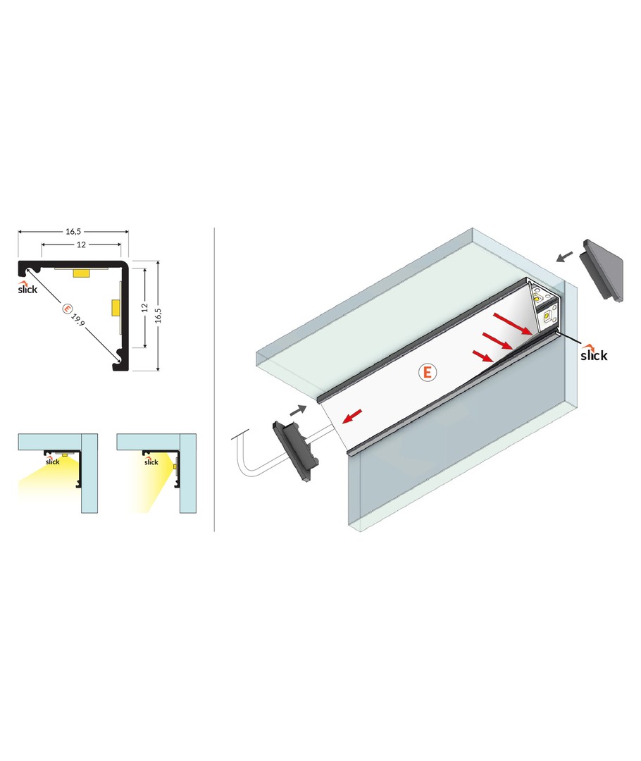 1m aluminiumprofiel CABI12 DUO E is een geanodiseerd LED-profiel ontworpen voor montage in hoeken.