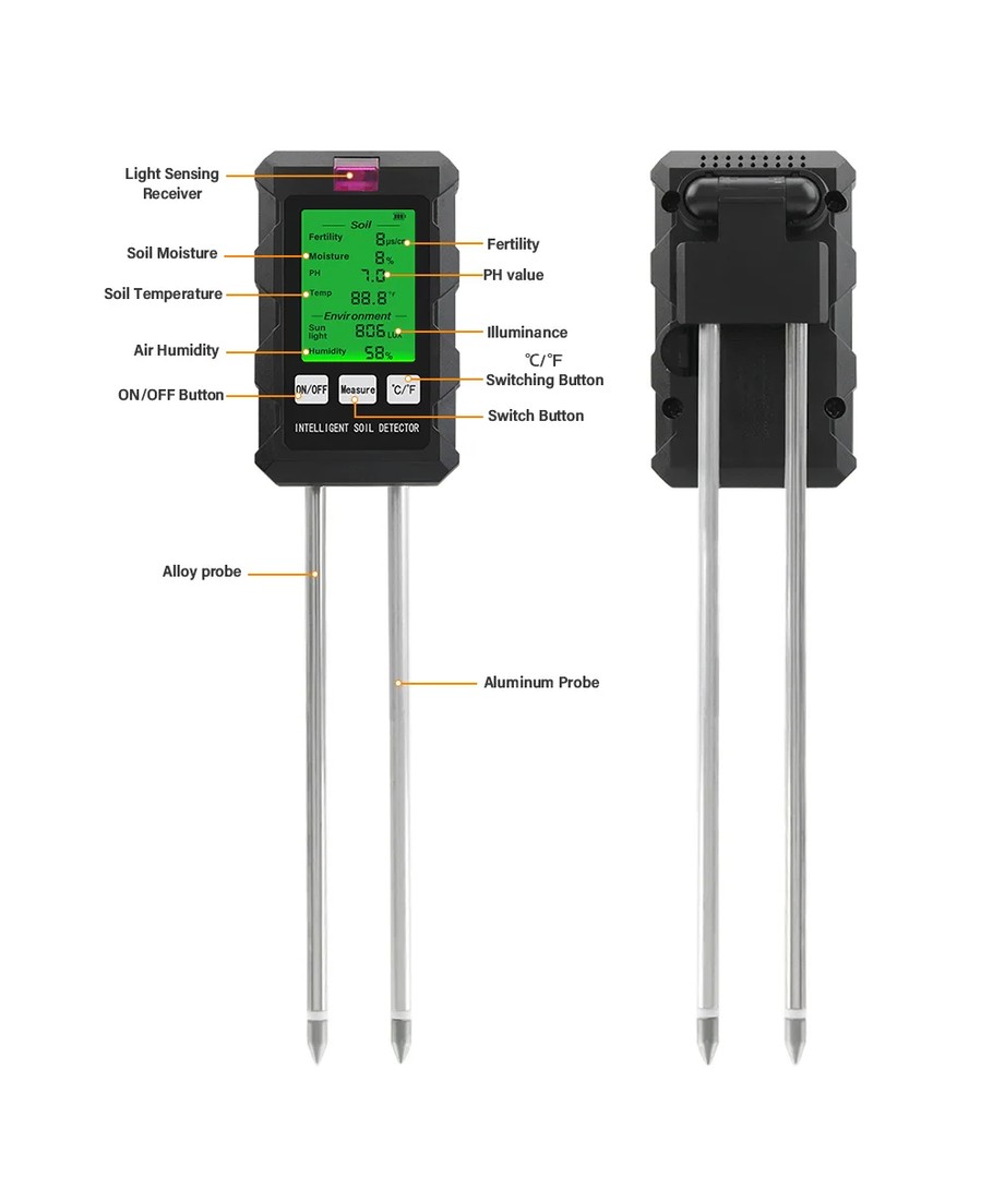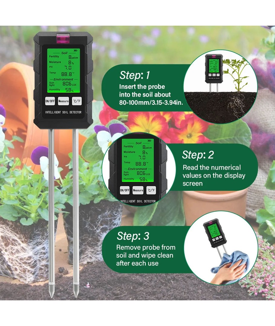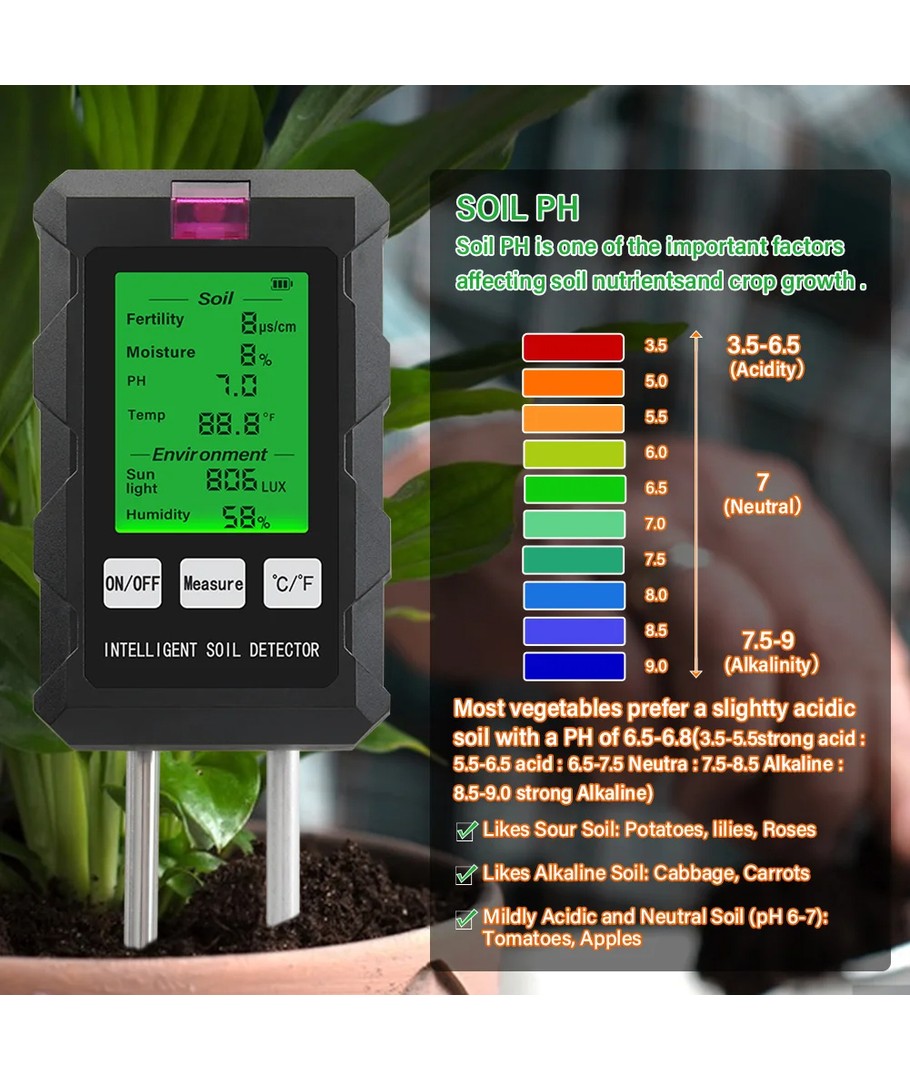 Ervaar precisie en veelzijdigheid met onze 6-in-1 meter, die de verzorging van uw planten vereenvoudigt door pH, vocht, temperatuur, lichtintensiteit, voedingsgehalte van de grond en luchtvochtigheid te meten in één compacte eenheid.