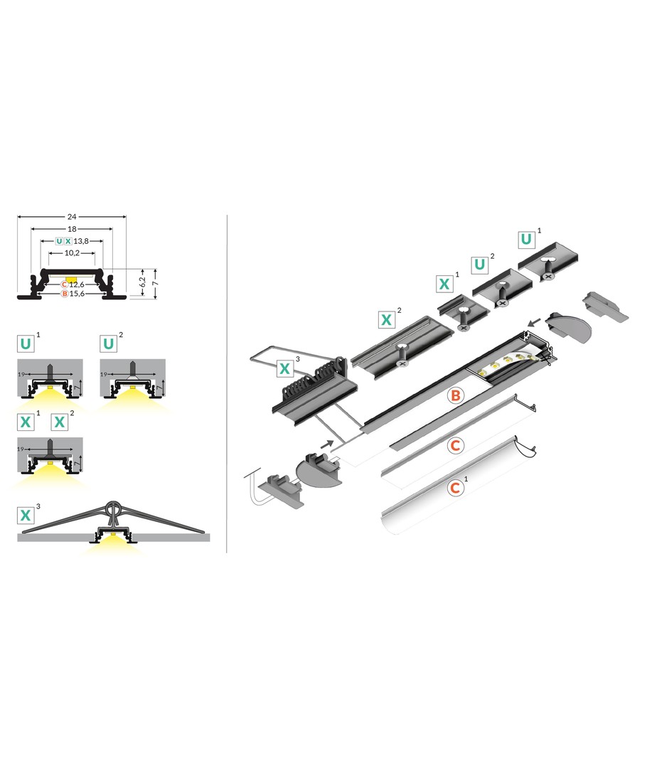 1m aluminium profiel GROOVE10 BC/UX is ontworpen voor inbouw en is ideaal voor LED-strips.