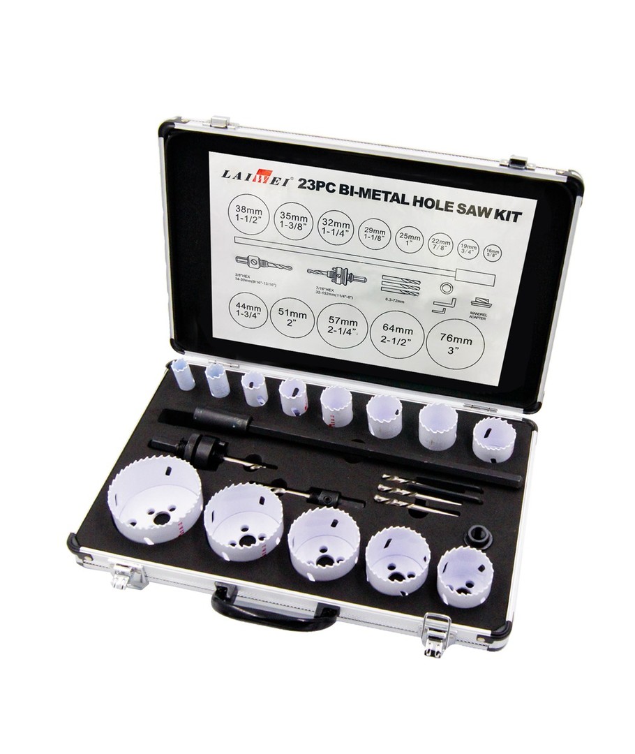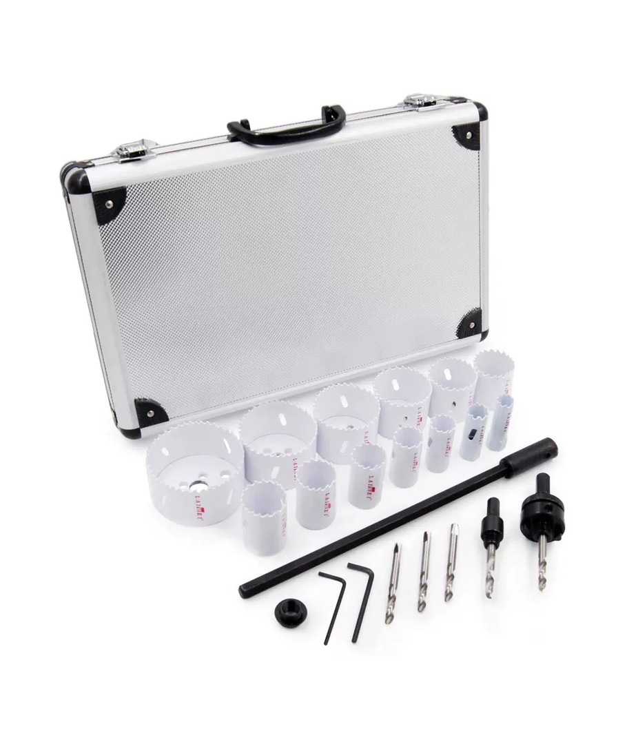 Complete set met alles wat u nodig heeft om gaten te boren in diverse hout- en plafondplaten voor de montage van spots, kabels etc.