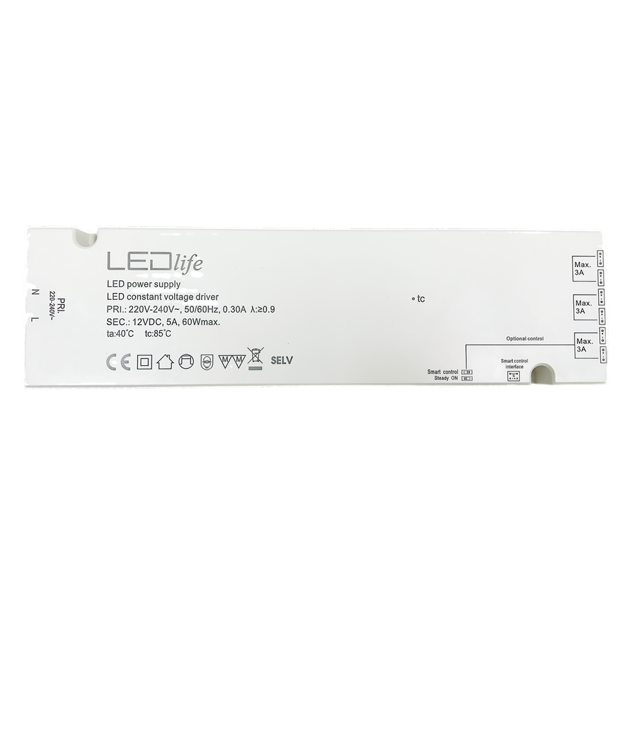 Het product biedt een totaal vermogen van 60W, waarmee je tot 6 LED spots kunt aansluiten, zodat je het licht eenvoudig kunt aanpassen aan jouw wensen. Door de voeding aan te sluiten op een 230V voeding, levert deze een stabiele 12V uitgang, speciaal ontworpen voor LED-verlichting.