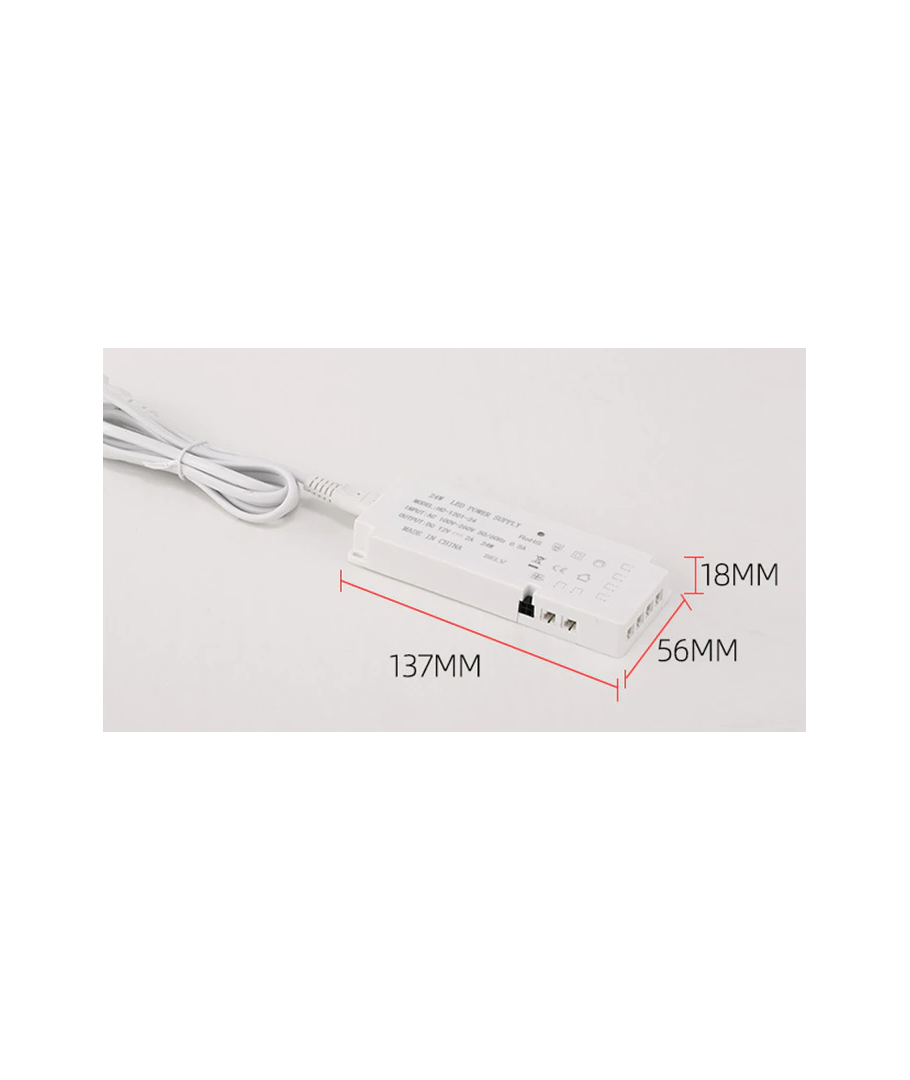 Deze voeding is compact en discreet met de afmetingen 55 x 18 x 138 mm, waardoor hij gemakkelijk te installeren is in verschillende meubelopstellingen. Met zijn geavanceerde ontwerp levert hij betrouwbare energie, wat ervoor zorgt dat uw spots de gewenste verlichting zonder onderbrekingen bieden.
