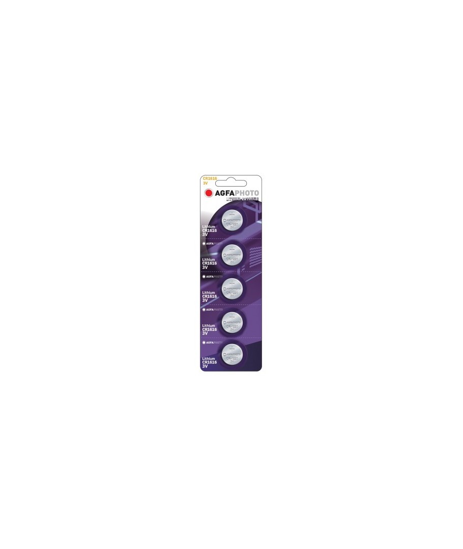 5 stuks CR1616 knoopcelbatterij van AgfaPhoto.Wordt gebruikt voor onder andere speelgoed, rekenmachines, autosleutels of afstandsbedieningen.
