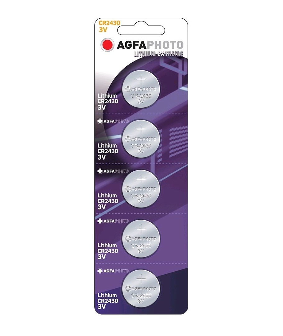 5 stuks CR2430 knoopcelbatterijen van AgfaPhoto.Wordt gebruikt voor onder andere speelgoed, rekenmachines, autosleutels of afstandsbedieningen.