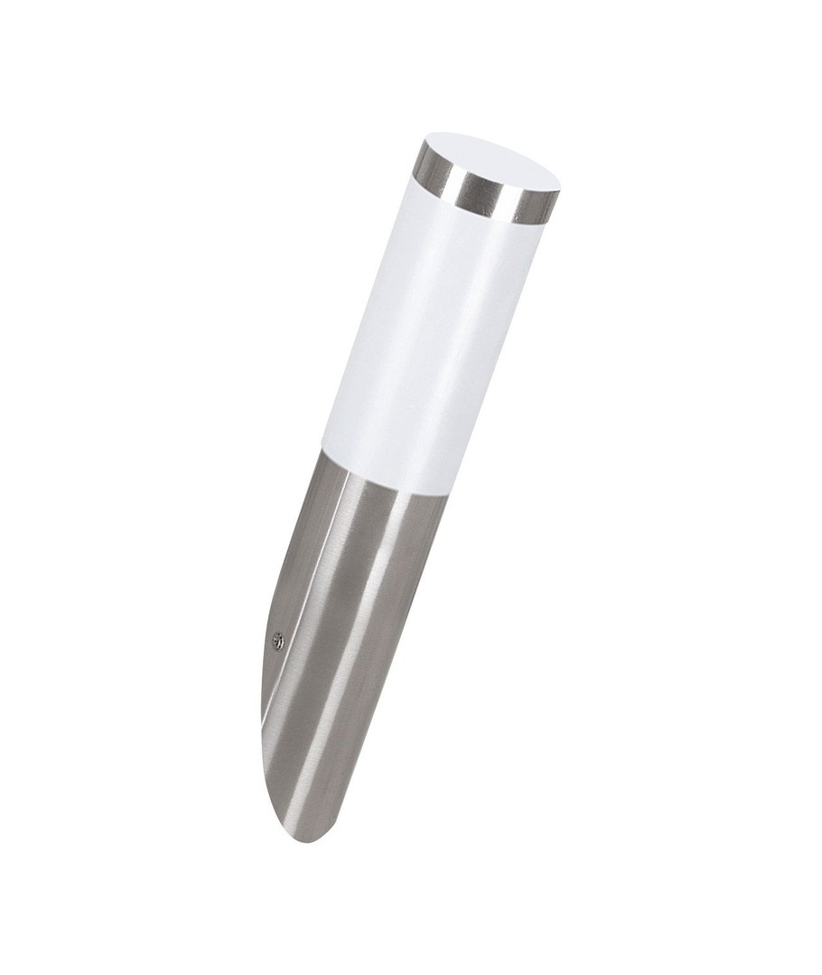 HELSINKI schuine wandlamp met sensor, heeft een cilindrische roestvrijstalen behuizing uitgerust met een witte kunststof 360° opalen kap.