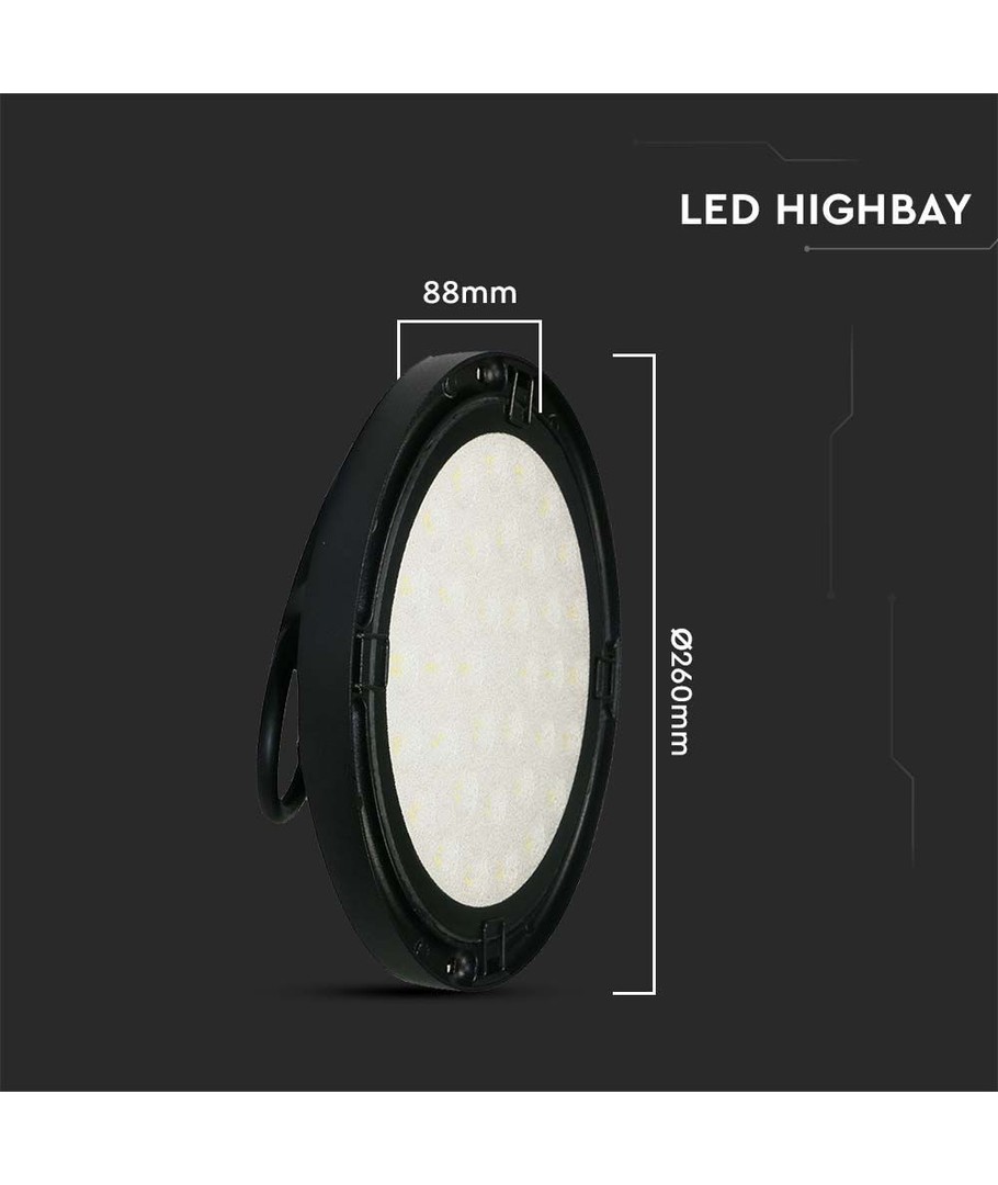 Met afmetingen van 88 x Ø260 mm past deze LED high bay perfect in elke ruimte. Hij is zowel discreet als functioneel. Het product heeft ook een IP65-classificatie, wat betekent dat hij zowel binnen als buiten gebruikt kan worden, omdat hij bestand is tegen waterstralen en regen.