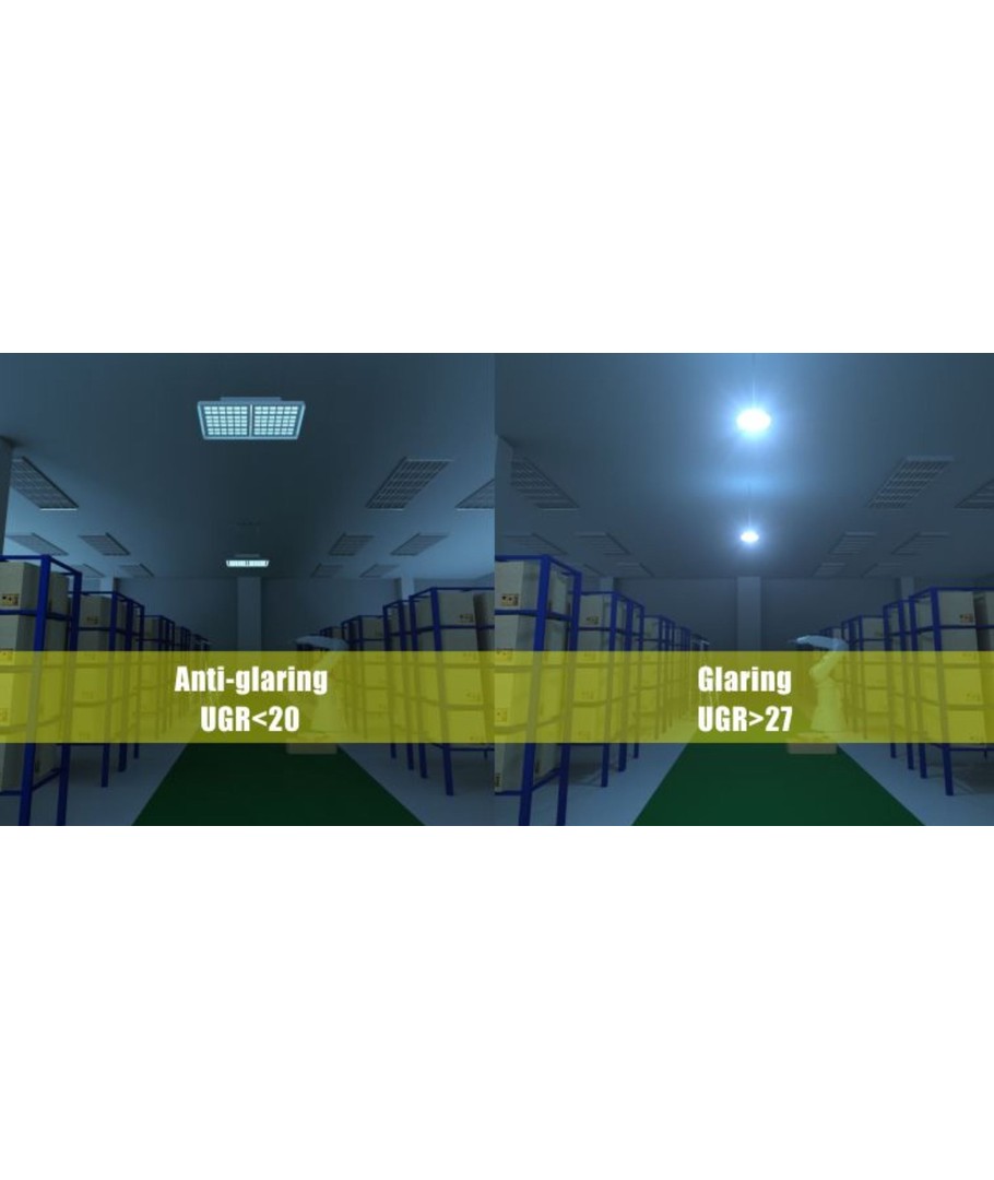 De lamp geeft een krachtig licht met een hoog rendement per watt, terwijl hij met UGR<19 niet verblindt.