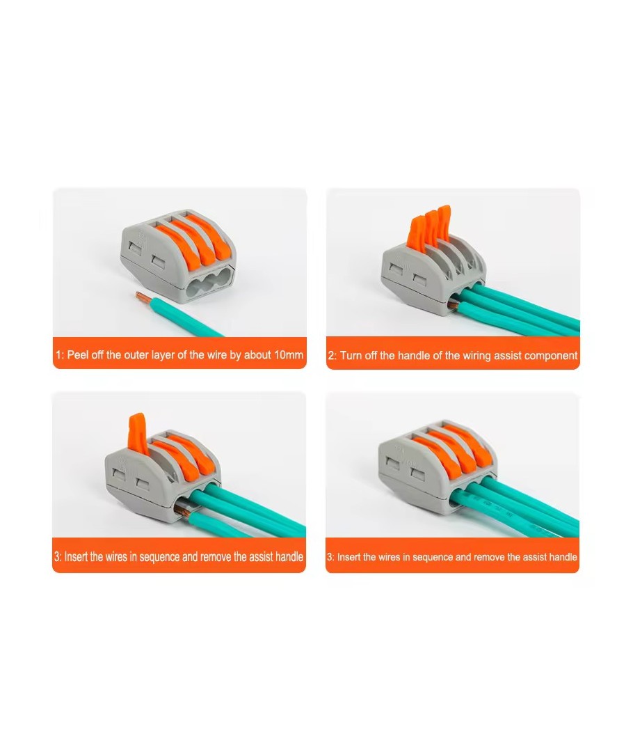 Schroefloze verbindingsklemmen die tegelijkertijd kunnen worden gebruikt voor zowel flexibele als starre geleiders. Ze hebben een praktisch aansluitingssysteem met een oranje hefboom, waardoor het gemakkelijk is om de flexibele geleiders in de gaten te krijgen.