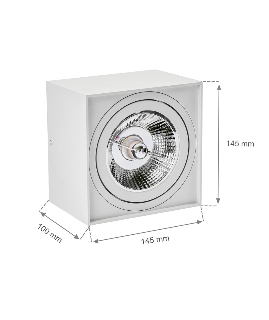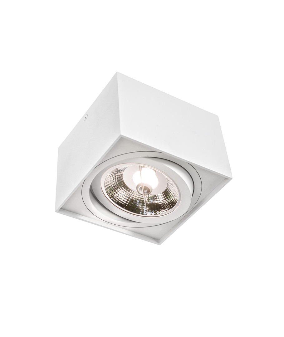 Ervaar de stijlvolle en functionele CHLOE AR111 plafondlamp - een vierkante, witte lamp die een elegante afwerking combineert met verstelbare verlichting.