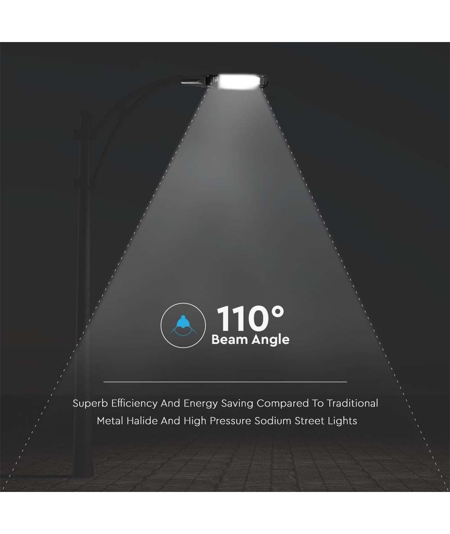 De V-Tac straatlamp levert een indrukwekkende lichtsterkte van 2510 lumen, wat ervoor zorgt dat elk gebied effectief wordt verlicht. Met een brede straalhoek van 110 graden garandeert de lamp een gelijkmatige lichtverdeling, waardoor hij ideaal is voor uitgebreide buitenruimtes.