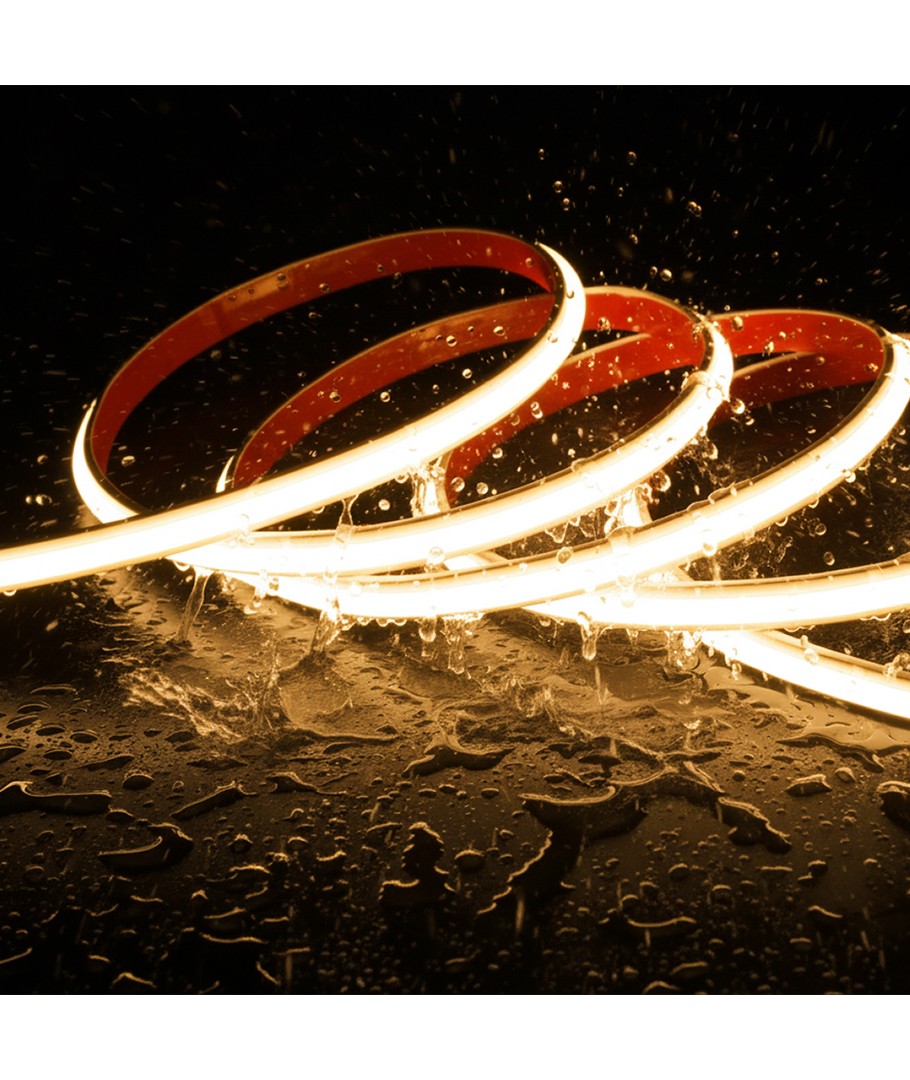 Deze waterdichte slanke COB LED-strip op 230V levert een krachtig, gelijkmatig licht zonder zichtbare diodes. Dit betekent dat je een elegant lichtlint krijgt zonder gaten in het licht – en omdat de strip direct op 230V werkt, is er geen transformator nodig. De installatie is eenvoudig met de vooraf gemonteerde tape aan de achterkant, en je kunt deze bestellen in lengtes tot 50 meter in één stuk.