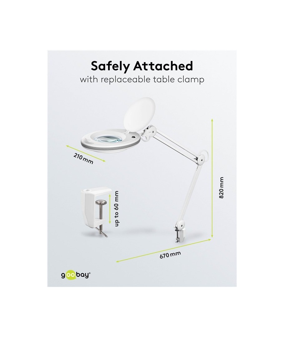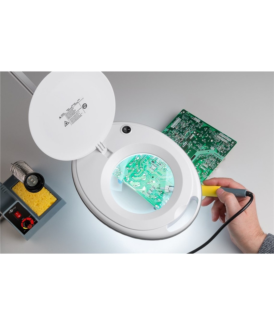 De loeplamp is ontworpen met een klem die eenvoudig aan elk werkoppervlak kan worden bevestigd, wat hem zeer flexibel en mobiel maakt. De lange arm biedt verstelbare verlichting die kan worden aangepast aan de behoefte en situatie.