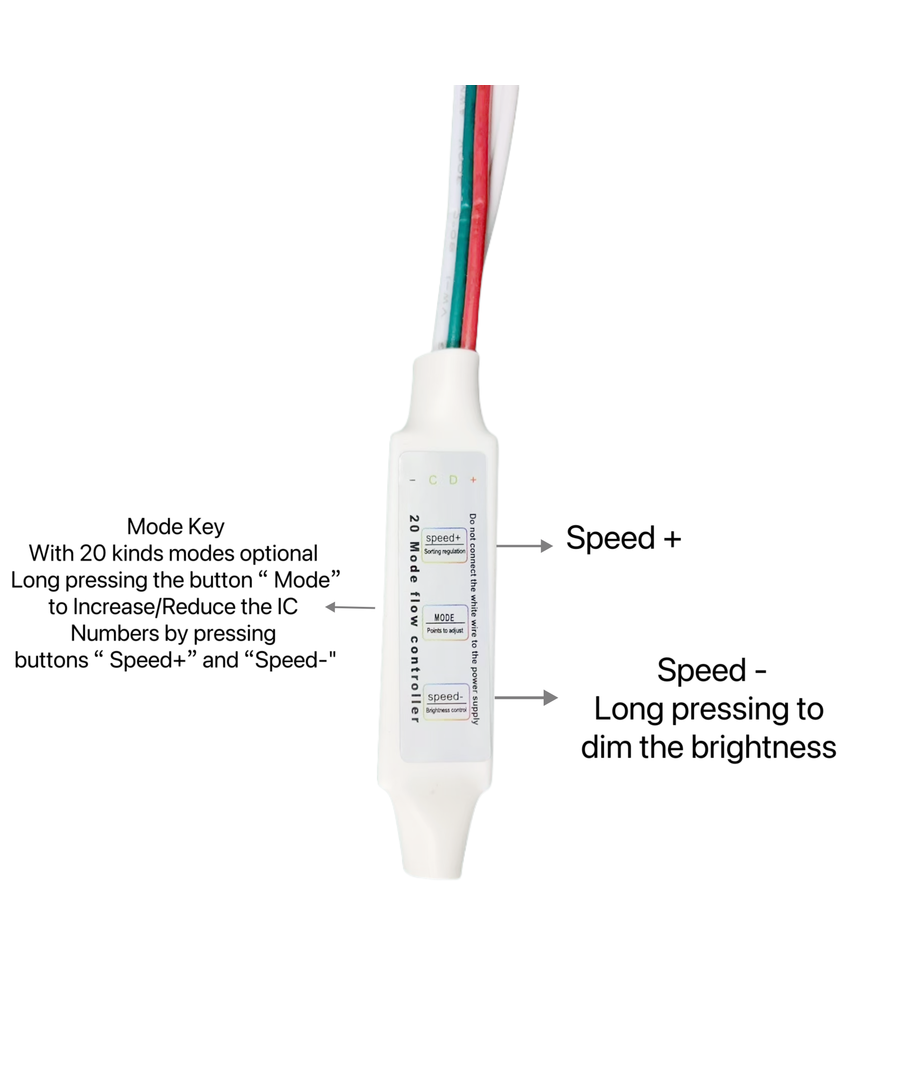 Stel het aantal IC-modules dat wordt aangestuurd in door de "Mode" knop ingedrukt te houden, gebruik daarna "Speed+" of "Speed-" om het aantal omhoog/omlaag aan te passen.