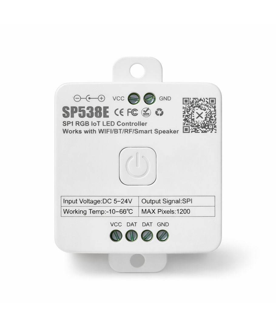 De SP538E is het intelligente brein voor je IC RGB-strips, die WiFi, Bluetooth en RF-besturing combineert in één compacte eenheid. Creëer unieke sferen met 146 dynamische lichteffecten en 5 muziekmodi, die direct worden bediend via de BanlanX-app. De controller ondersteunt tot 1200 pixels en populaire chiptypes zoals WS2811 en WS2812B, waardoor hij ideaal is voor alles, van gaming-setups tot woonkamerverlichting.