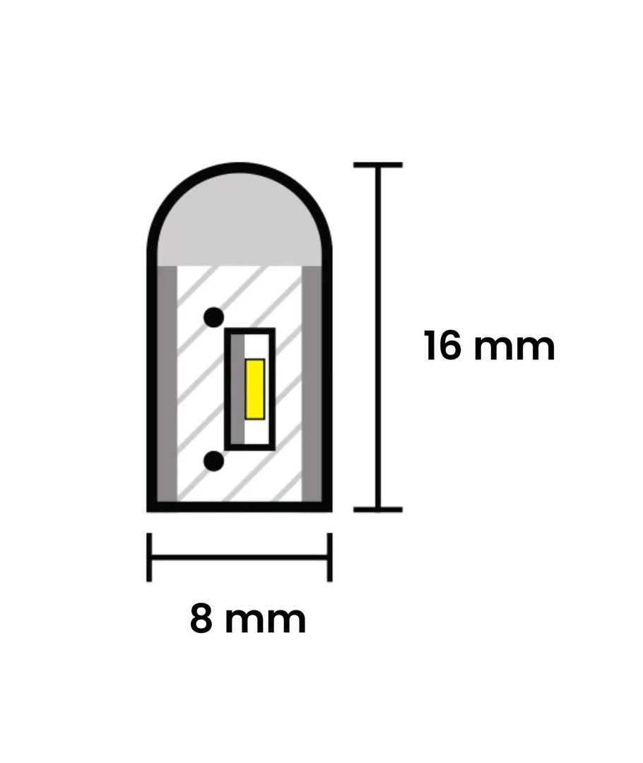 De robuuste constructie van deze LED-strip, met afmetingen van 8 x 16 mm, gecombineerd met een IP67 classificatie, maakt hem perfect voor buitengebruik. Hij is ontworpen om spatwater en korte onderdompeling te weerstaan, wat zorgt voor langdurige prestaties, zelfs onder uitdagende weersomstandigheden. Het is echter belangrijk om te weten dat verbindingen moeten worden afgedicht met heldere siliconen om de waterdichtheid van het product te behouden.