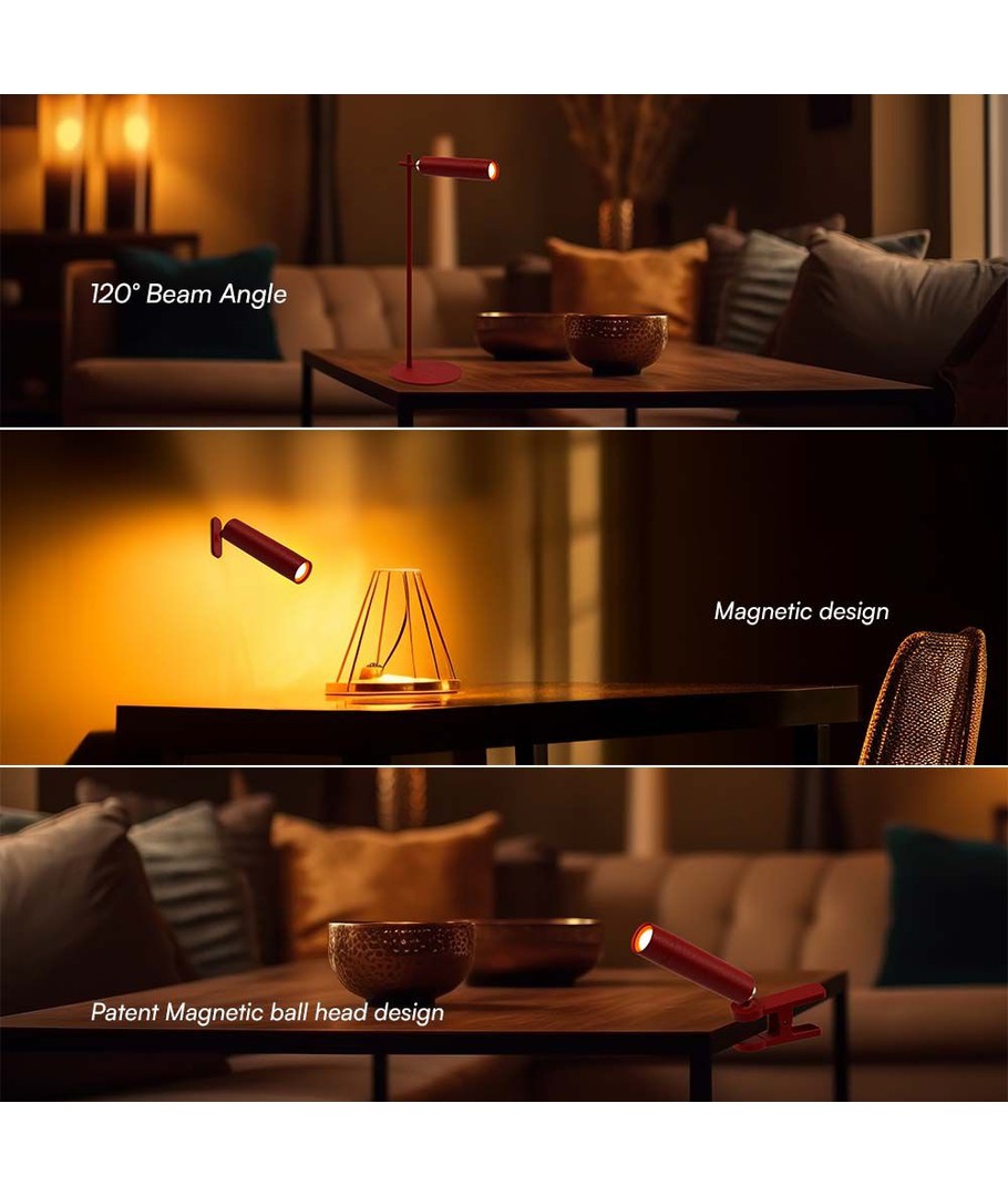 De magnetische basis maakt het gemakkelijk om de lamp precies te plaatsen waar u wilt. Met het robuuste ontwerp en een opvallende rode behuizing wordt de tafellamp een decoratieve toevoeging aan elke ruimte.