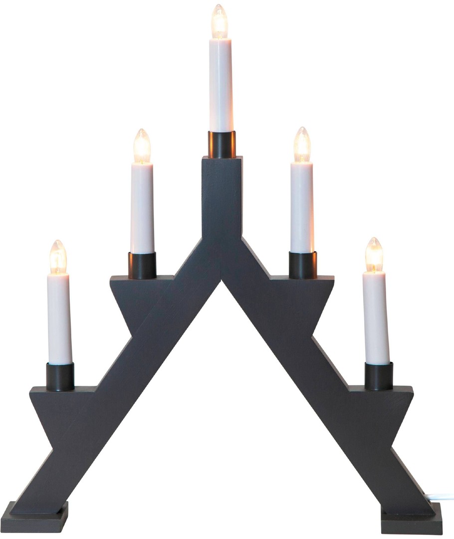 En smuk 5-armet Julelysestage i antracit med 5 hvide kertelys i varm hvid. Leveres med tilslutningsledning med afbryder på.