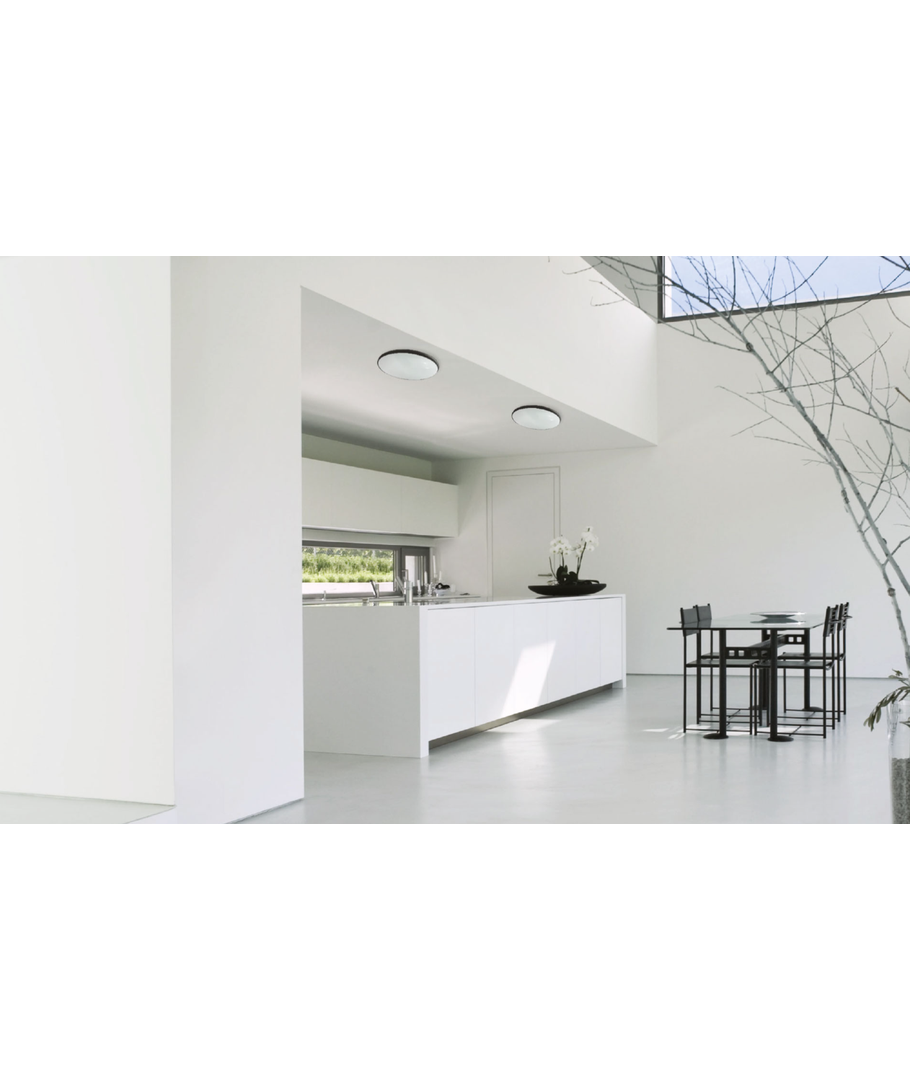 Met een diameter van 32 cm en een hoogte van slechts 5,2 cm combineert deze lamp een minimalistisch design met functionaliteit. Hij wordt geleverd met een witte rand en een inbegrepen zwarte ring, die een moderne touch aan uw ruimte geeft. Eenvoudig maar effectief, deze plafondlamp past perfect in elk stijlvol interieur.