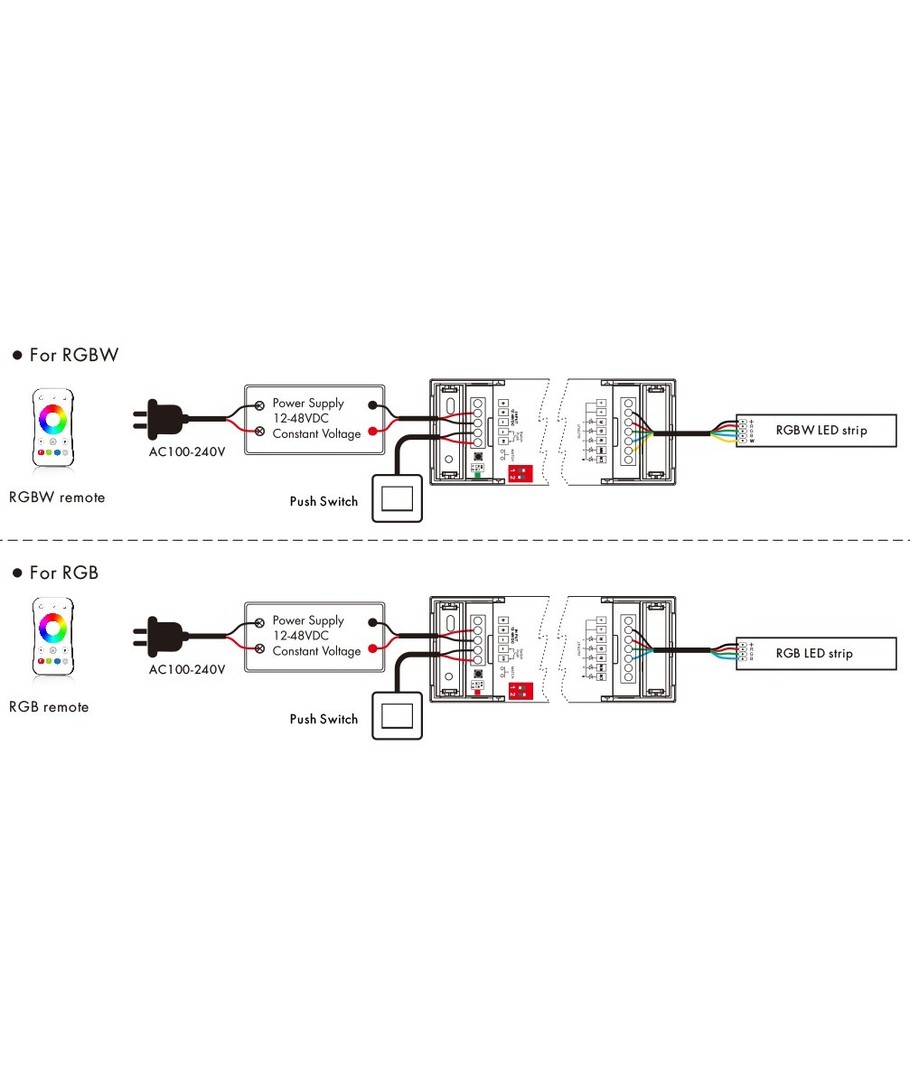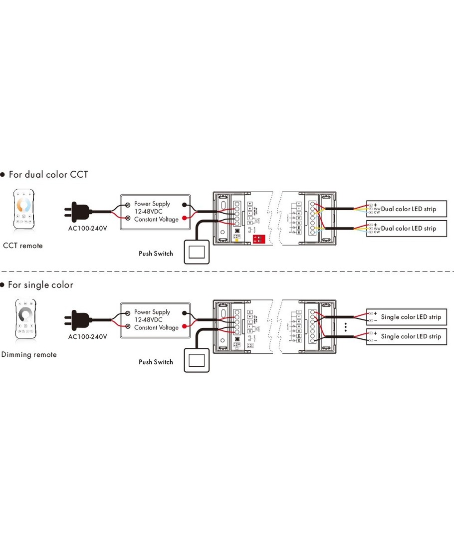 Geschikt voor RGB+CCT, RGB+W, RGB, CCT of enkelkleurige LED-strip.