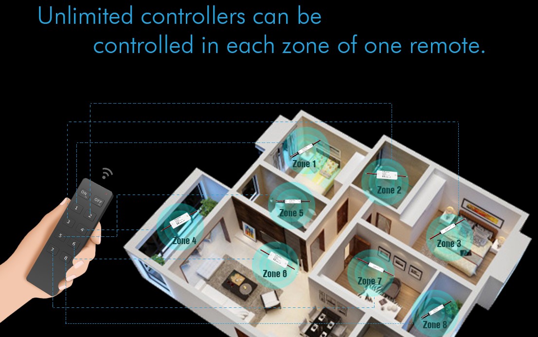 Bedien 12V, 24V, 230V & dimmen, CCT, RGB – alles met dezelfde afstandsbediening.