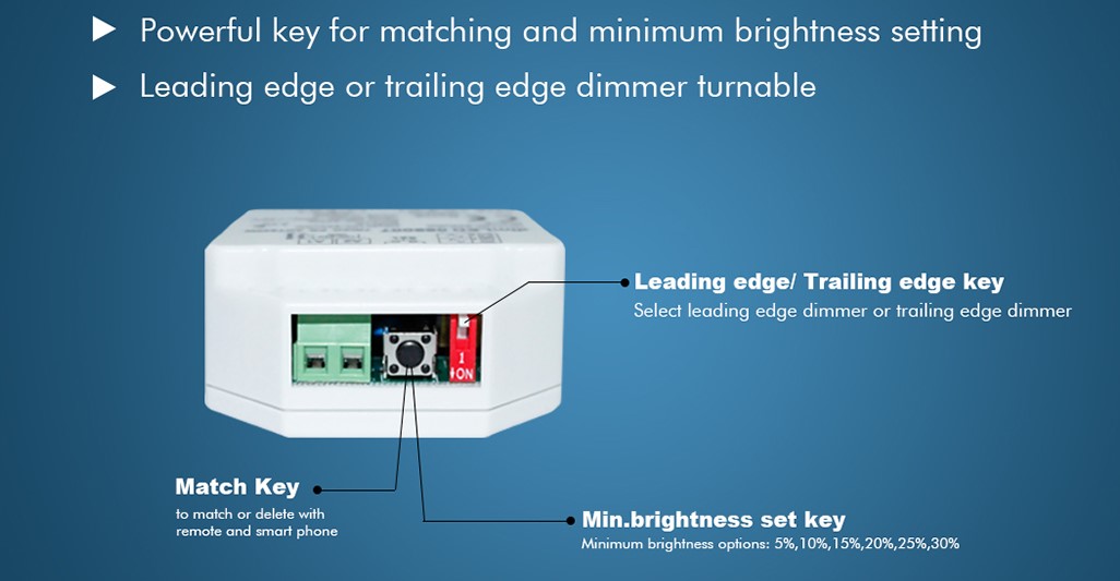 • Compact ontwerp: Met afmetingen van slechts 52 x 52 x 26 mm kan deze dimmer discreet in elke omgeving worden geïntegreerd zonder onnodige ruimte in te nemen.
